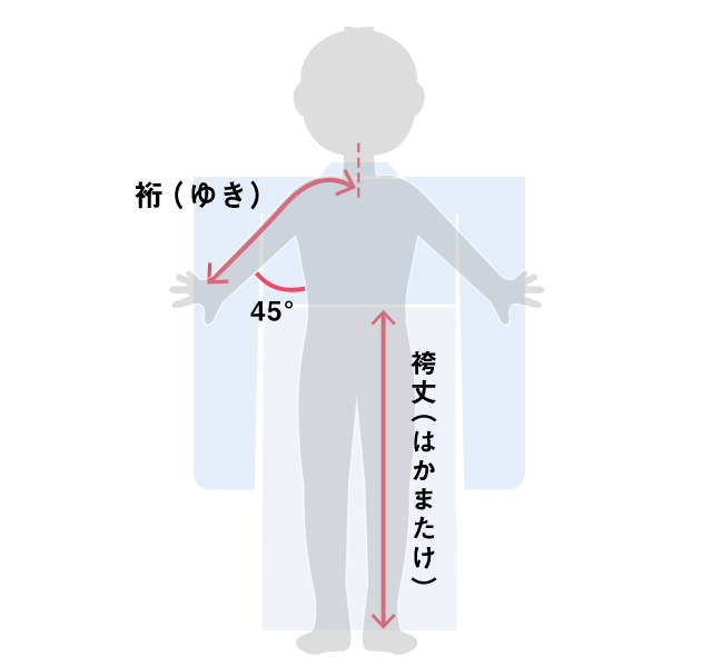 気をつけの姿勢で、腕をまっすぐ45度に開き、首のつけ根の後ろの中心から肩の頂点を通って手首のくるぶしが隠れるところまでの長さです。
