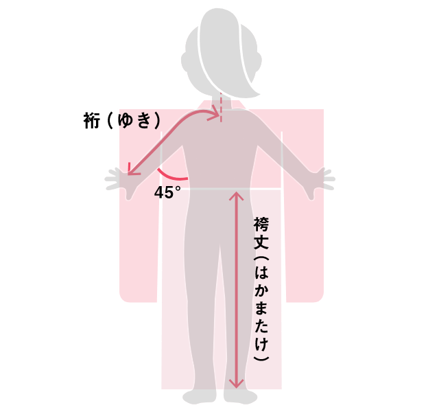気をつけの姿勢で、腕をまっすぐ45度に開き、首のつけ根の後ろの中心から肩の頂点を通って手首のくるぶしが隠れるところまでの長さです。