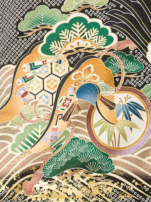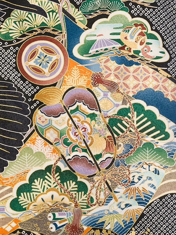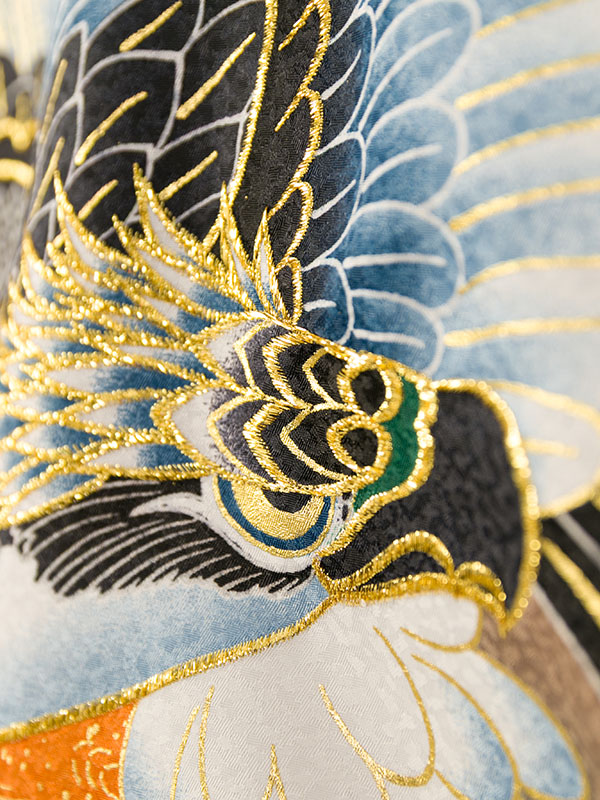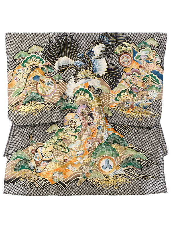 単衣 疋田黒 鷹 刺繍入り 金彩