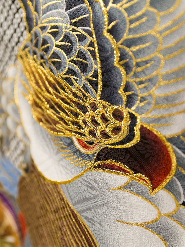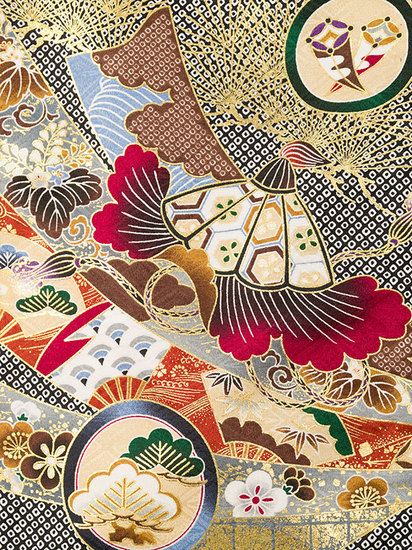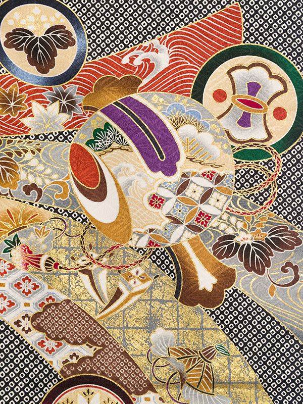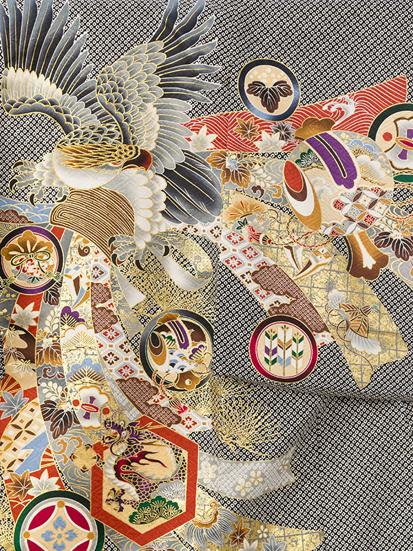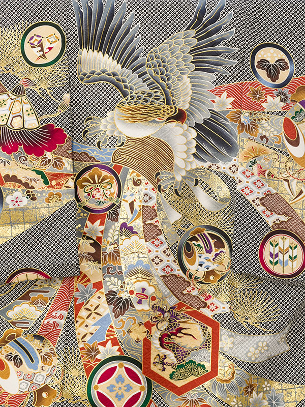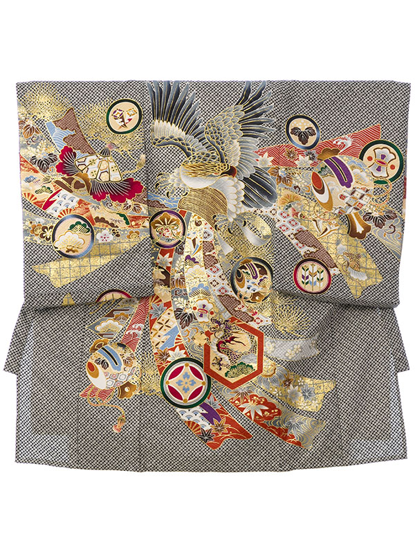 単衣 疋田黒 鷹 熨斗に古典吉祥文 刺繍入り 金彩