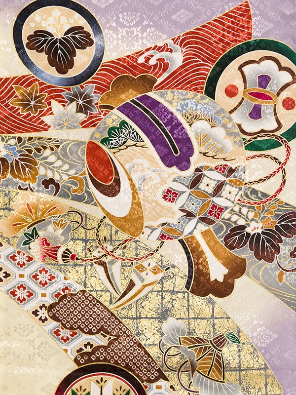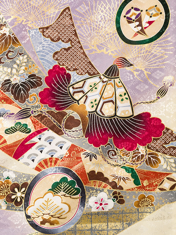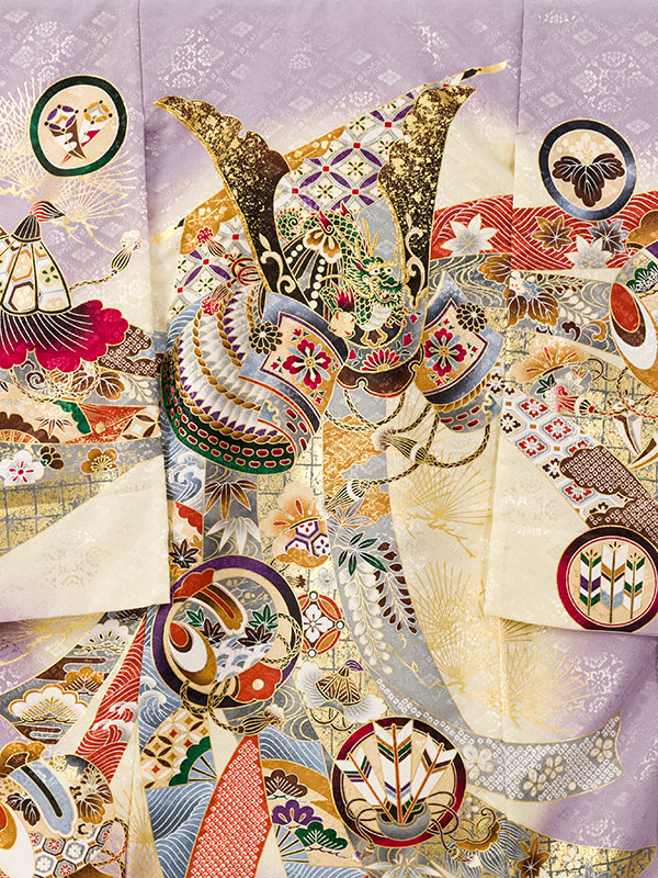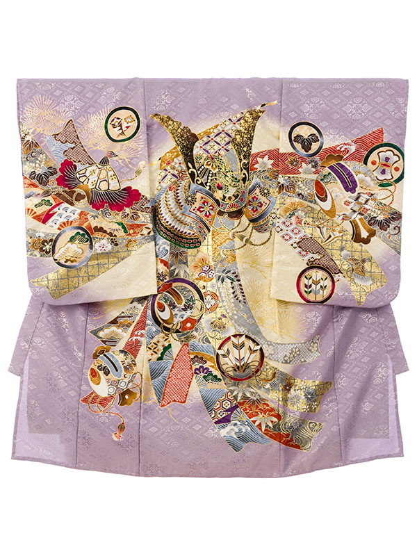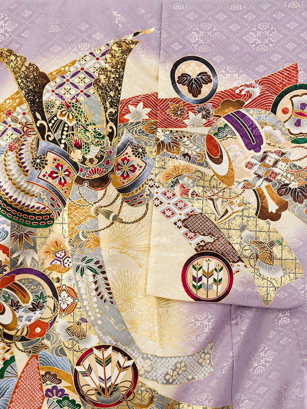 単衣 薄紫/クリーム 兜 刺繍入り 金彩