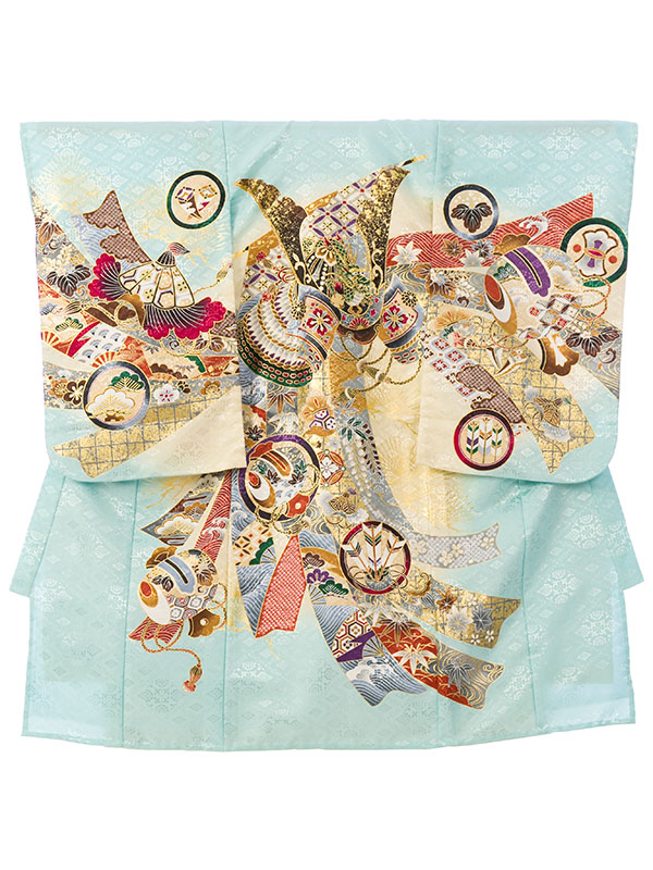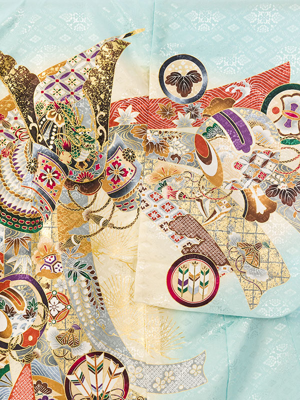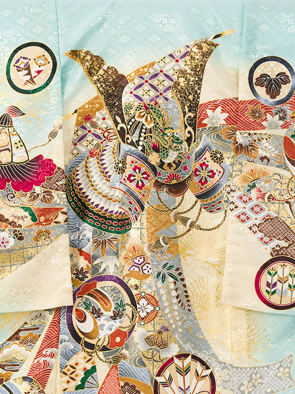 単衣 水色/クリーム 兜 刺繍入り 金彩