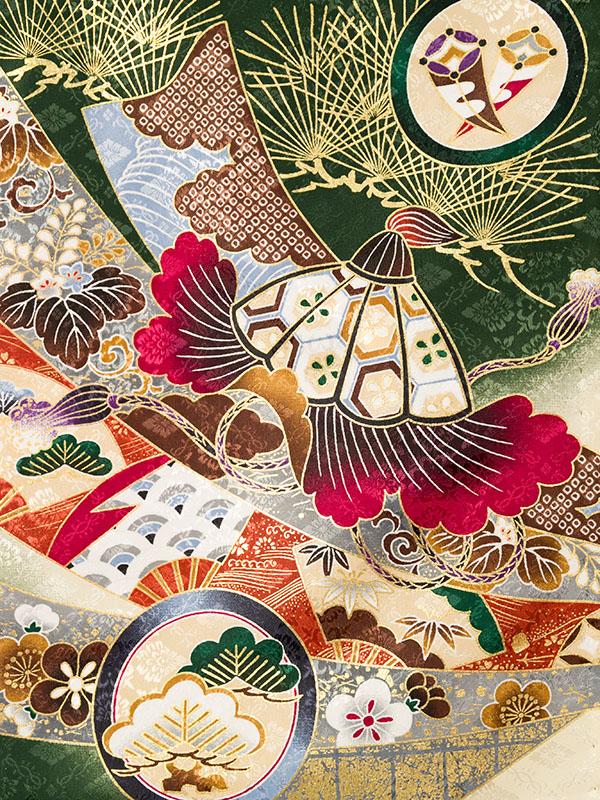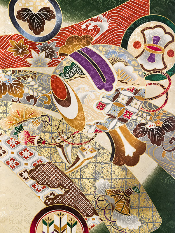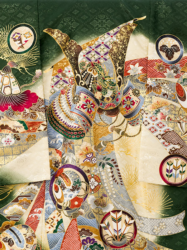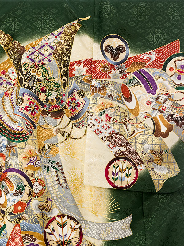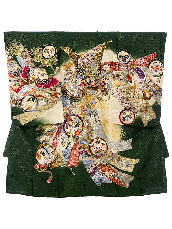 単衣 濃グリーン/クリーム 兜に熨斗 刺繍入り 金彩
