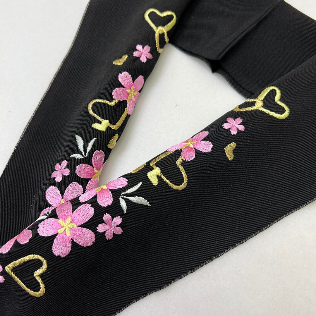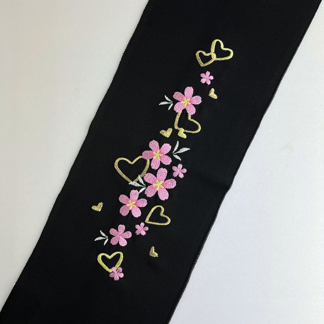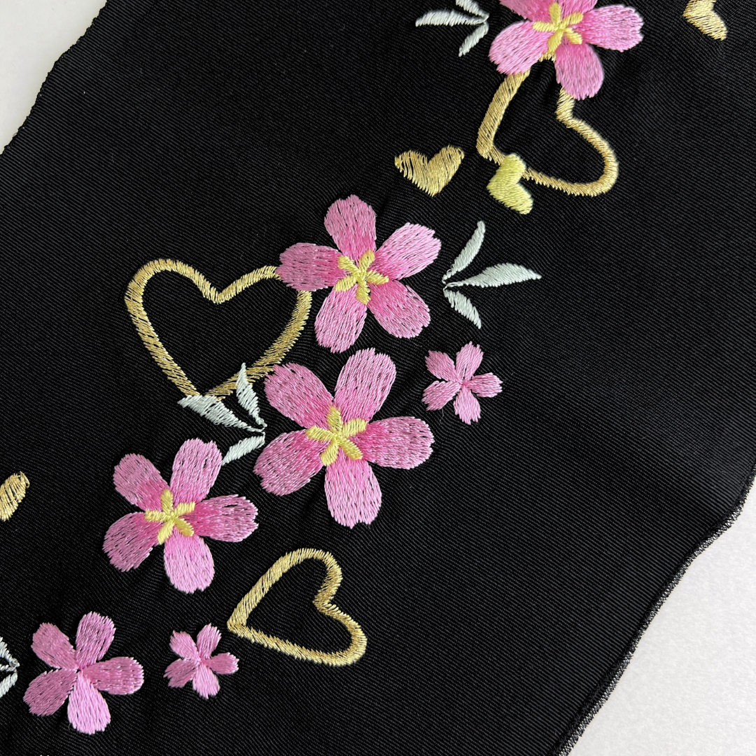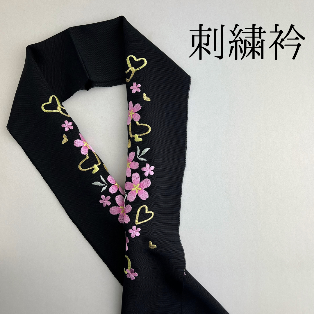 黒地に淡いピンクの桜が流れるように咲く、大人可愛いデザインの刺繍衿。