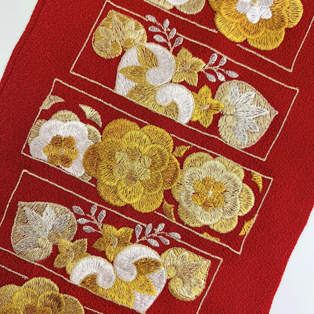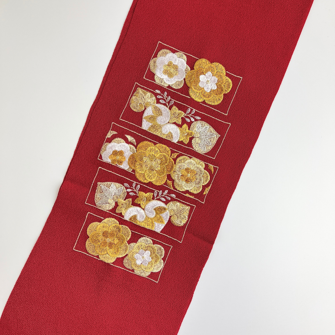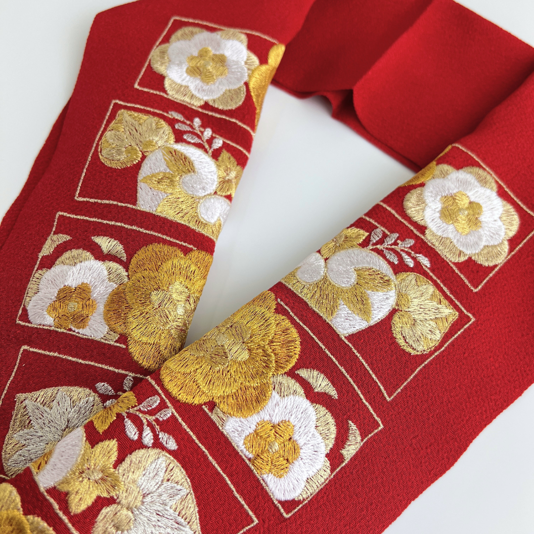 淡鮮やかな赤地に、繊細なゴールド刺繡がきらりと映える華やかな刺繡衿。