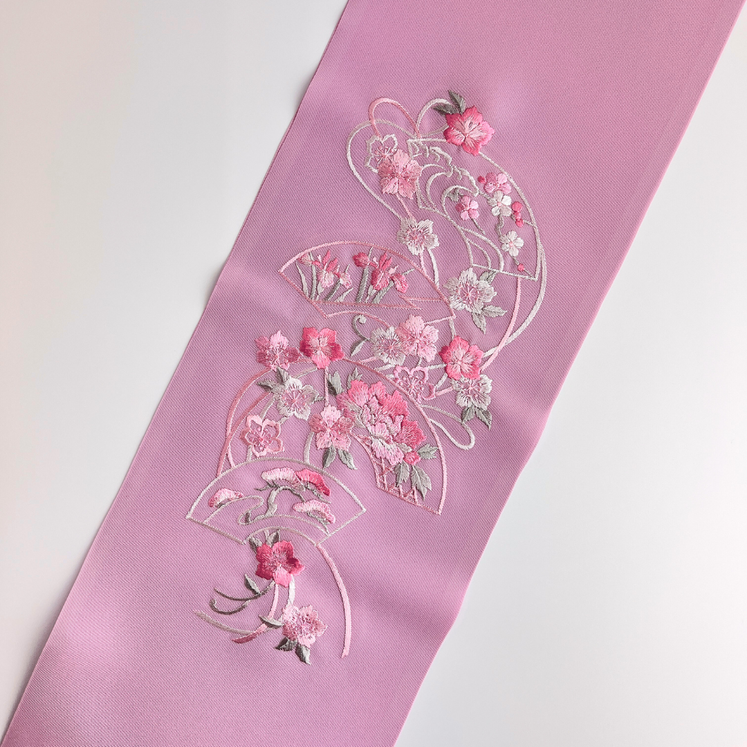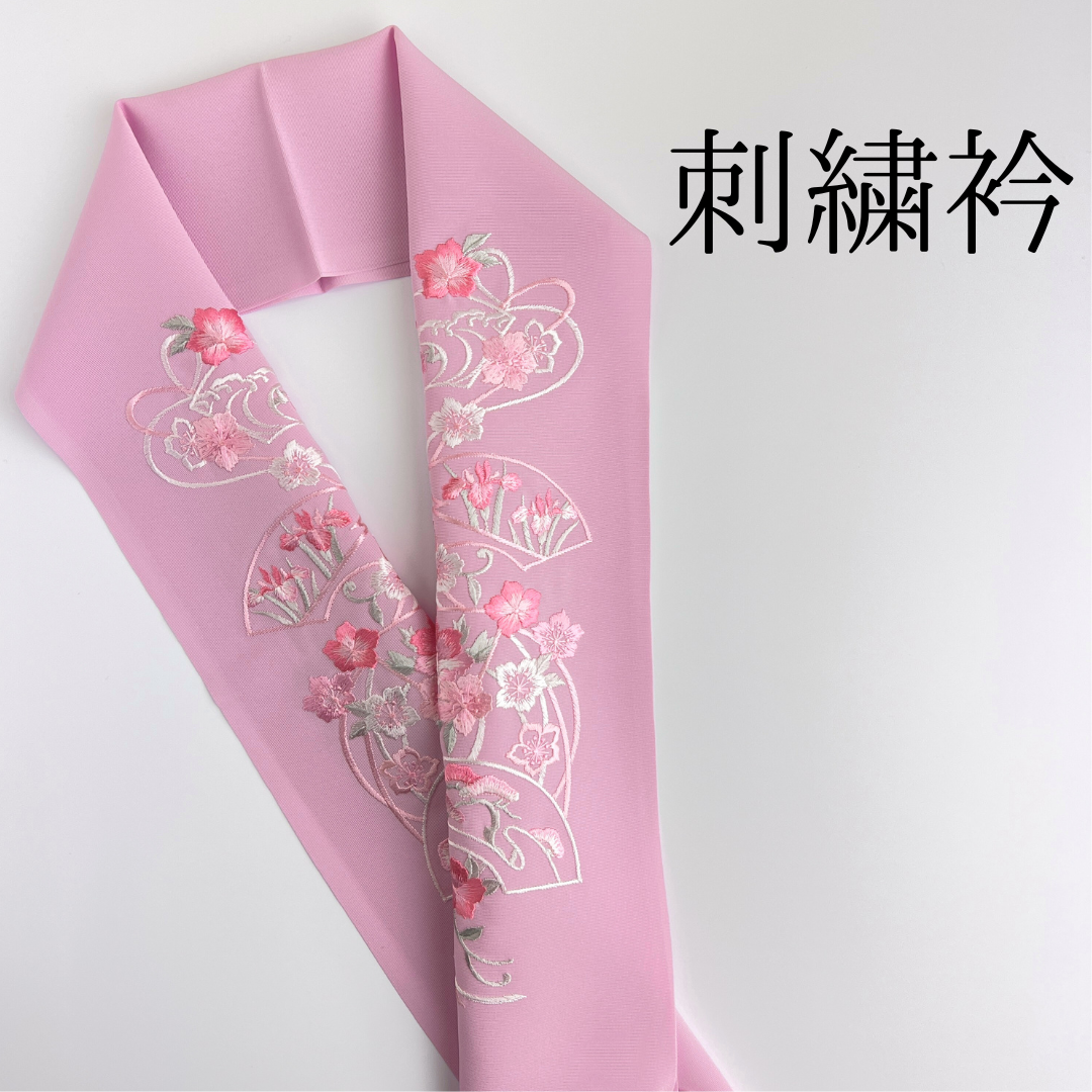 柔らかな薄紫地に、華やかな桜扇の刺繡が映える刺繡衿。