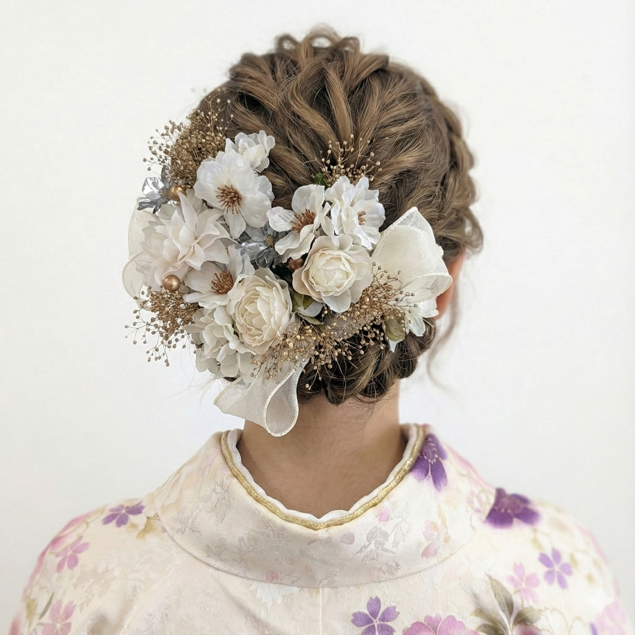 白とゴールドを基調にした、華やかさ抜群のボリューム髪飾り。