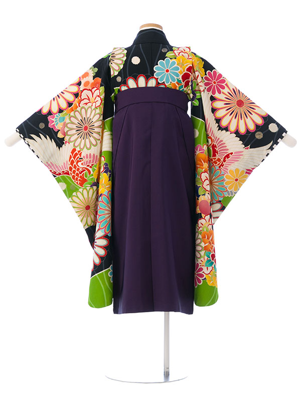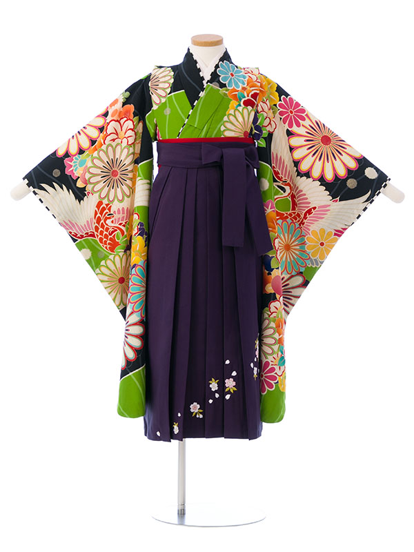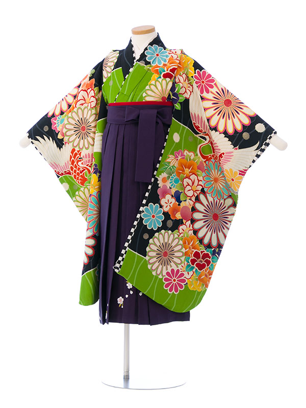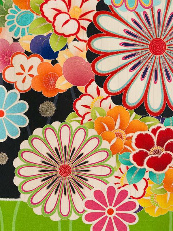 印象の強い黒に優しい緑地。あでやかな花くす玉に菊と鶴文様を大胆に描いてあります。