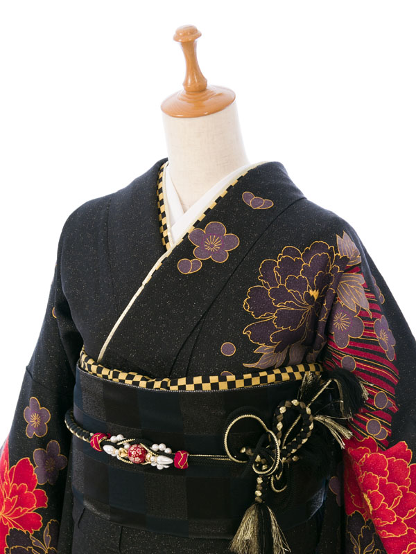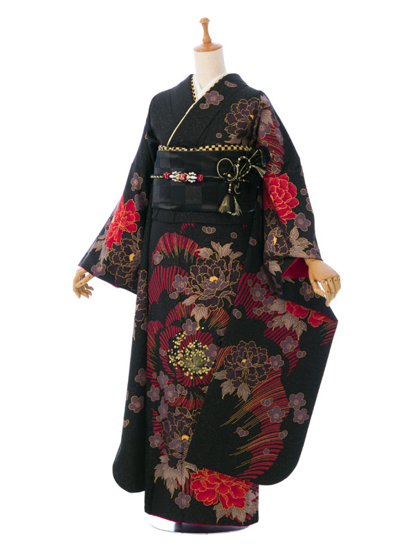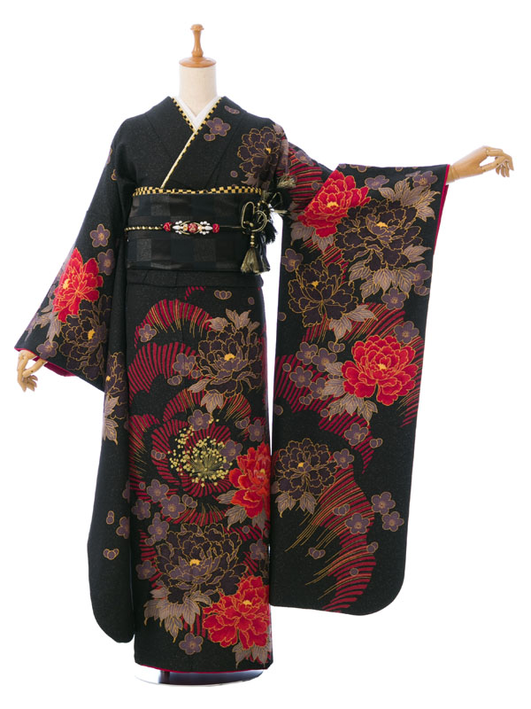 振袖|黒系| 牡丹 |6S640|対応身長:160-170cm|サイズ:7号-13号