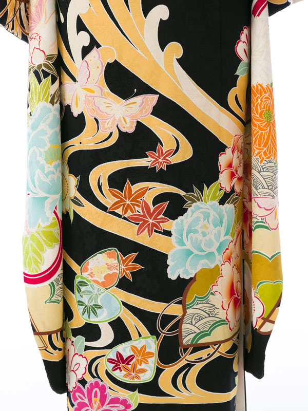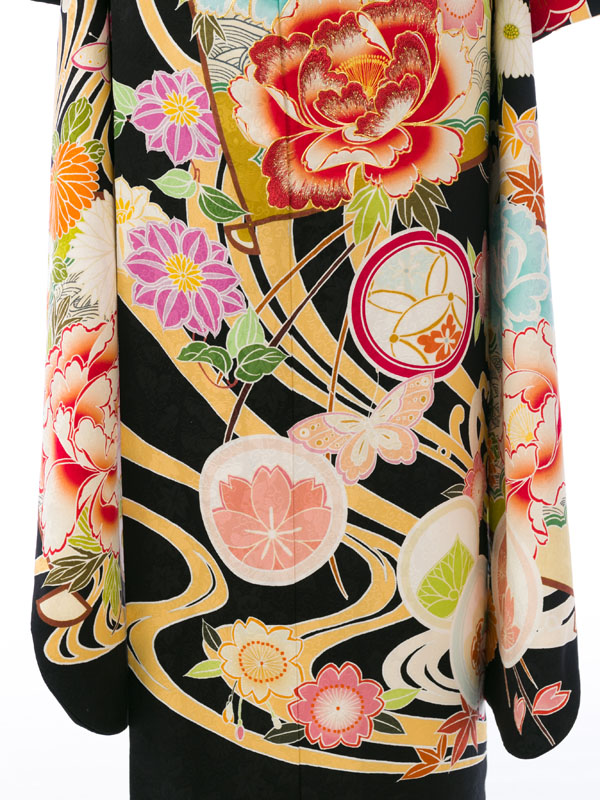 黒地 檜扇に牡丹 四季花 流水 古典柄