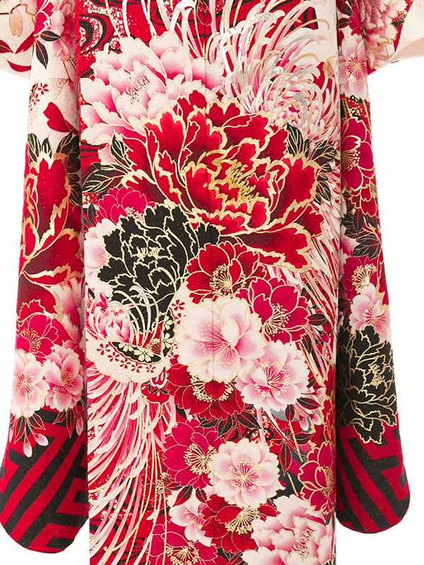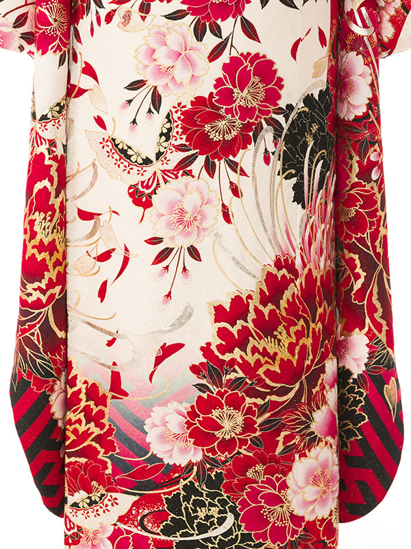 白/赤ラメ織/紗綾形 牡丹 桜菊 金彩銀彩