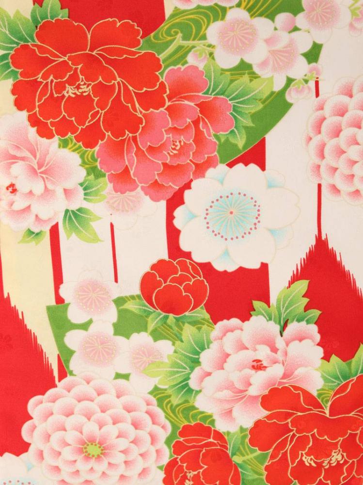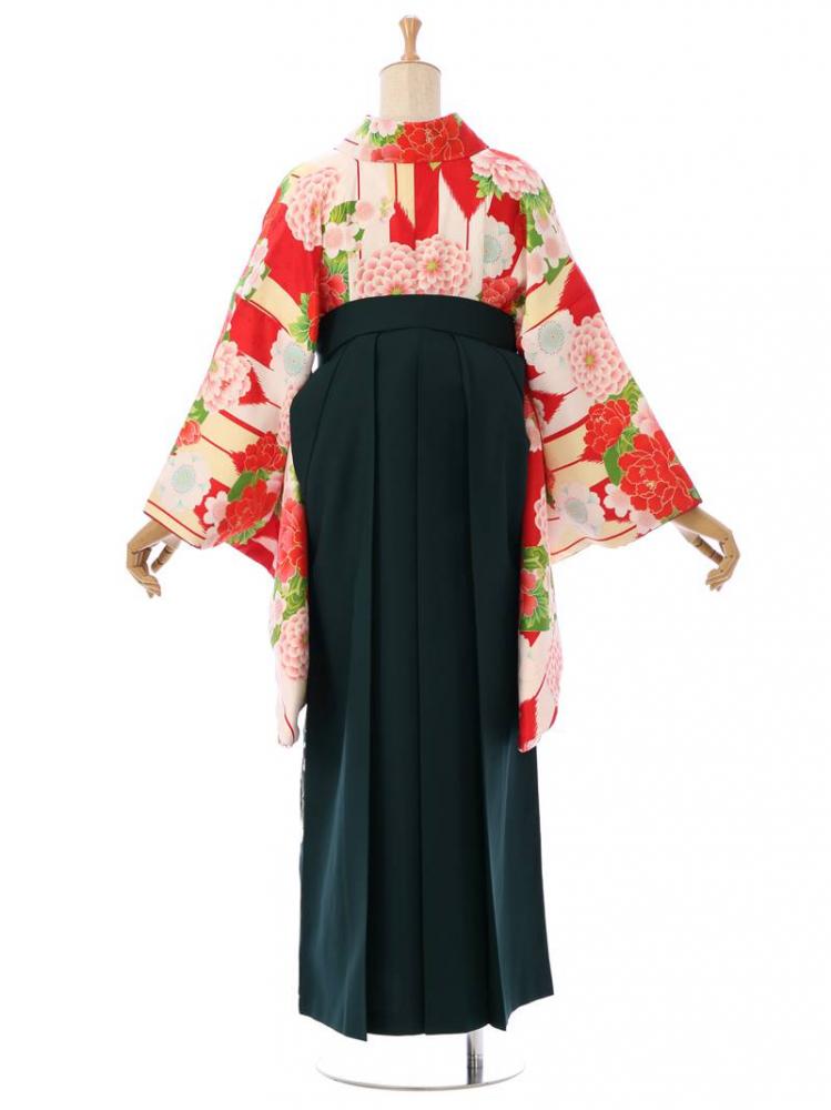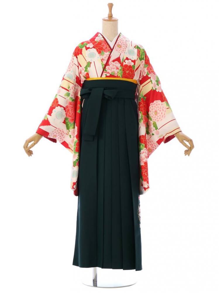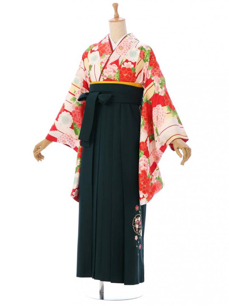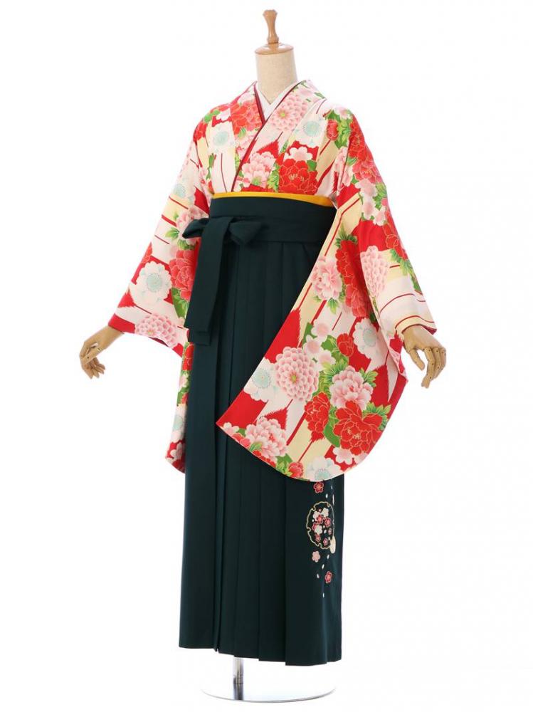 着物:赤×クリームホワイト 矢羽根 桜 牡丹 袴:緑地 雪輪に梅刺繍