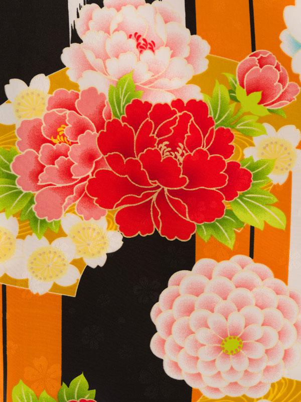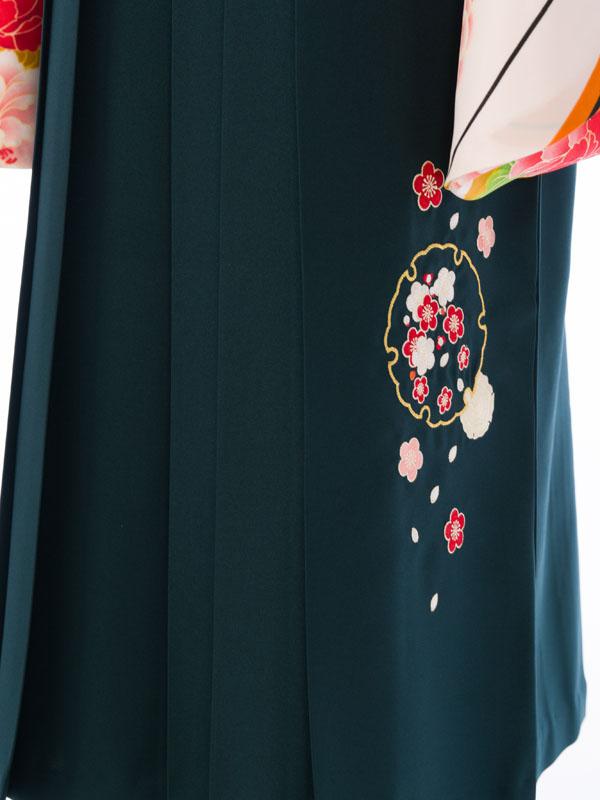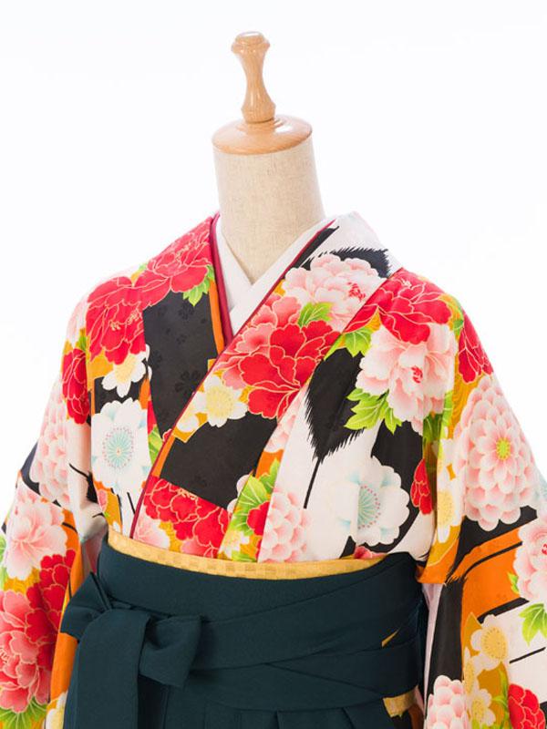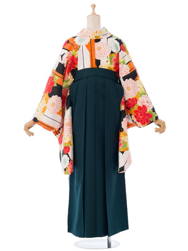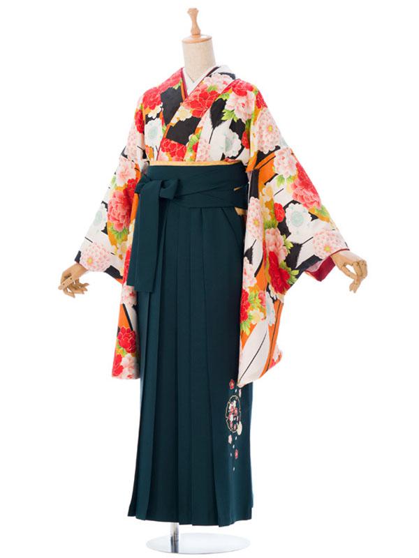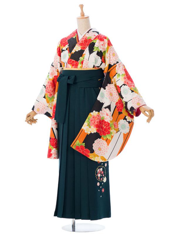 ■着物:黒×オレンジ 矢がすりに牡丹 桜■袴:グリーン袴 雪輪に梅刺繍 2.3
