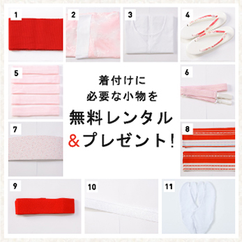 着物の着付けに必要な基本的な小物は全てセットでレンタルしております。ご自分での用意が不要ですので、追加費用もかからずお手軽にご利用いただけます。