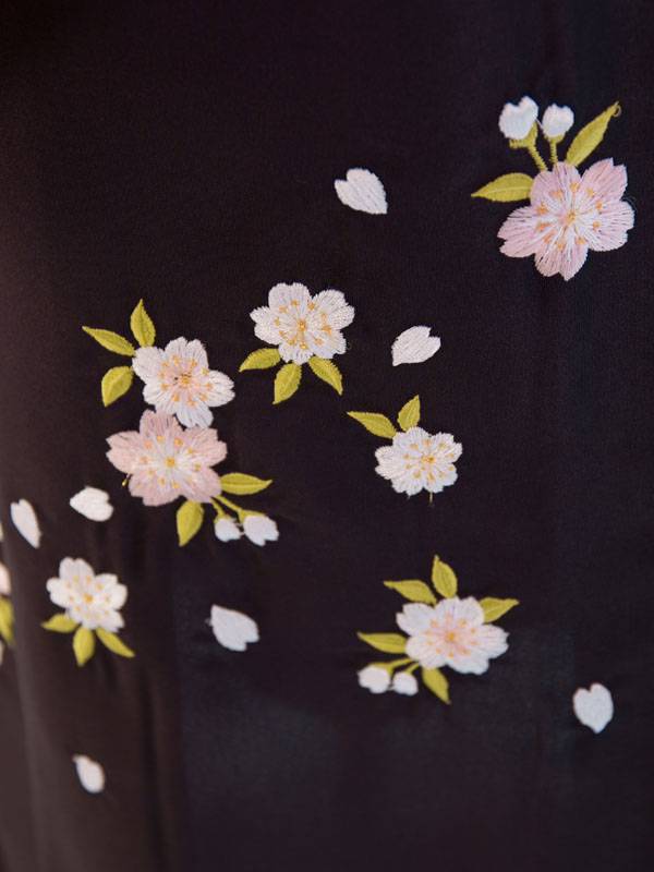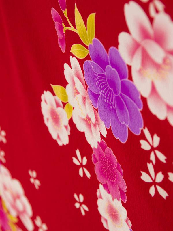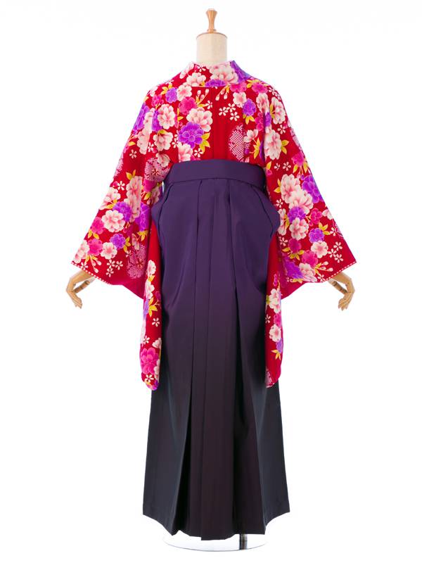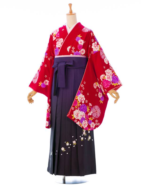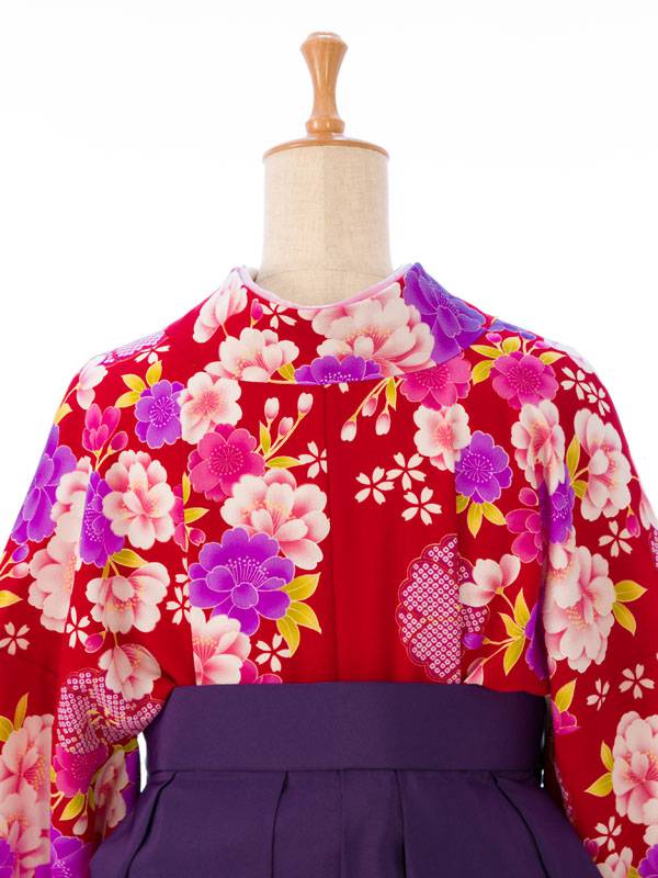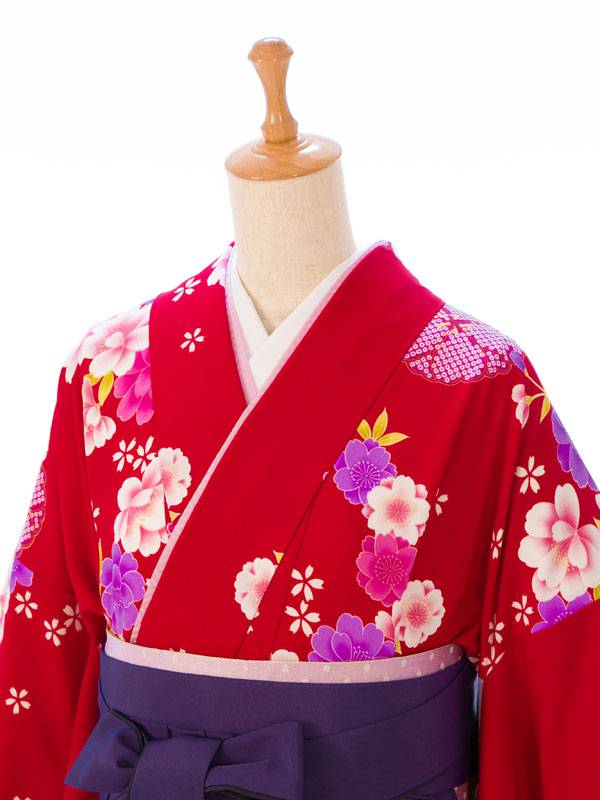 色/柄 着物:赤地 桜 鹿の子桜 袴:紫ぼかし 桜刺繍