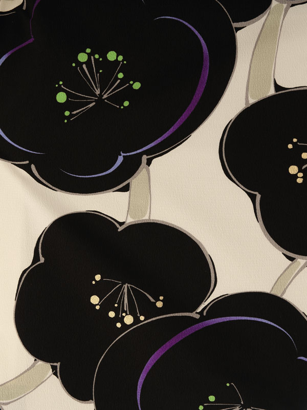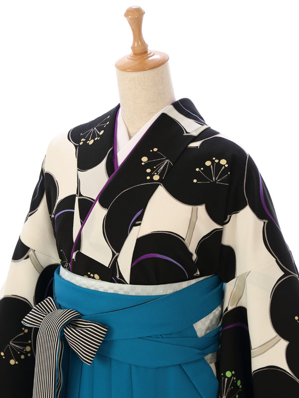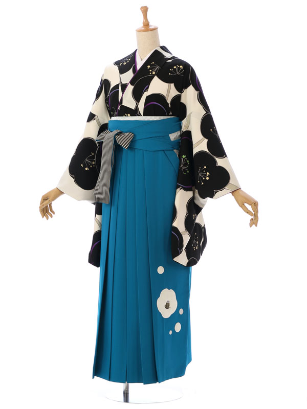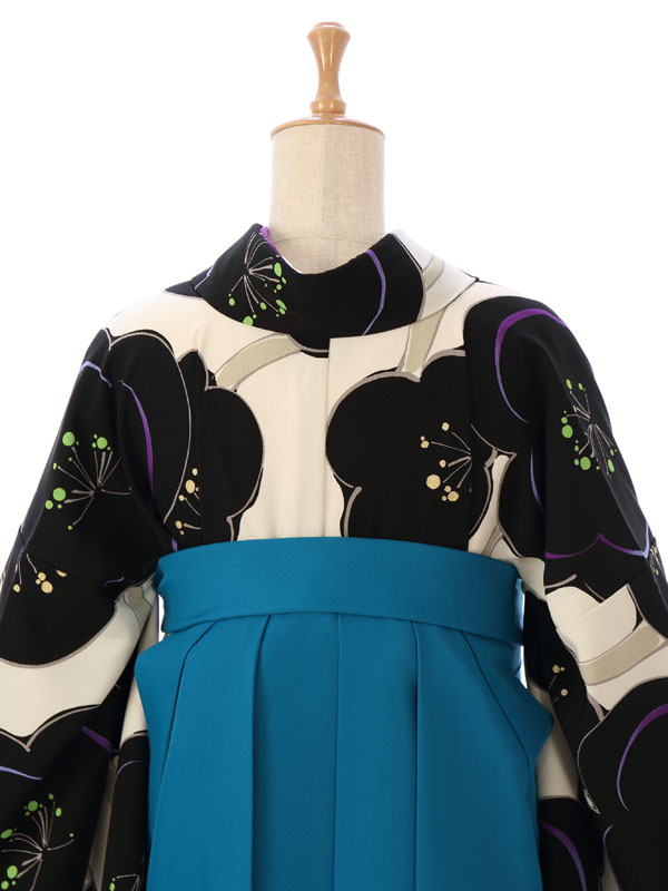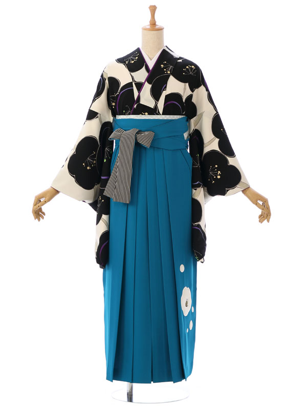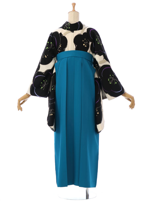 【色/柄】着物:クリーム 黒の大梅 袴:ターコイズ 椿