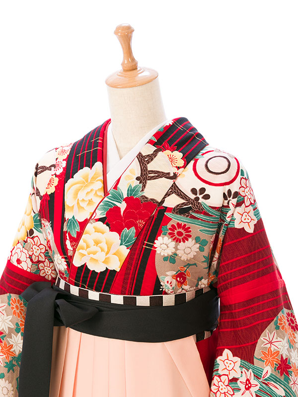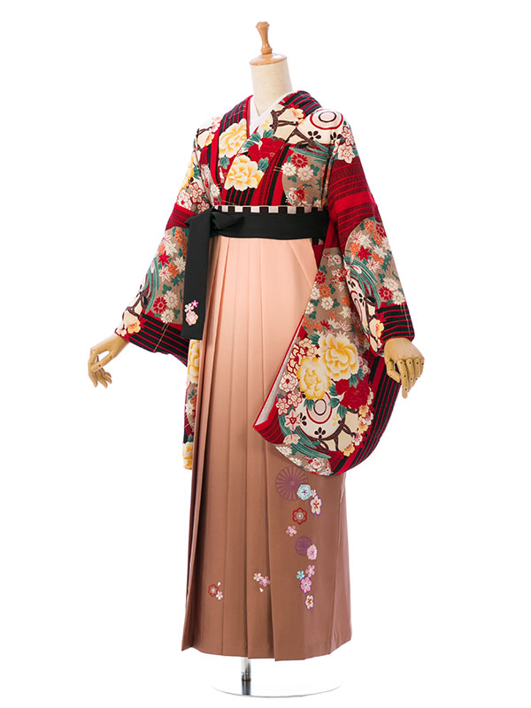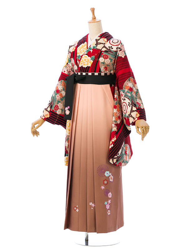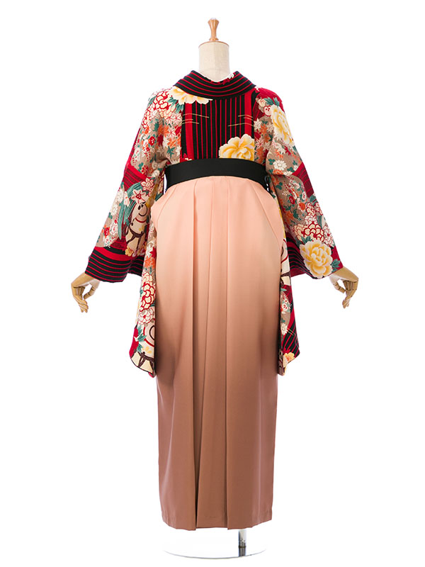 ■着物:赤×黒 縞に花■袴:.ベージュピンクぼかし 刺繍入り 2.5