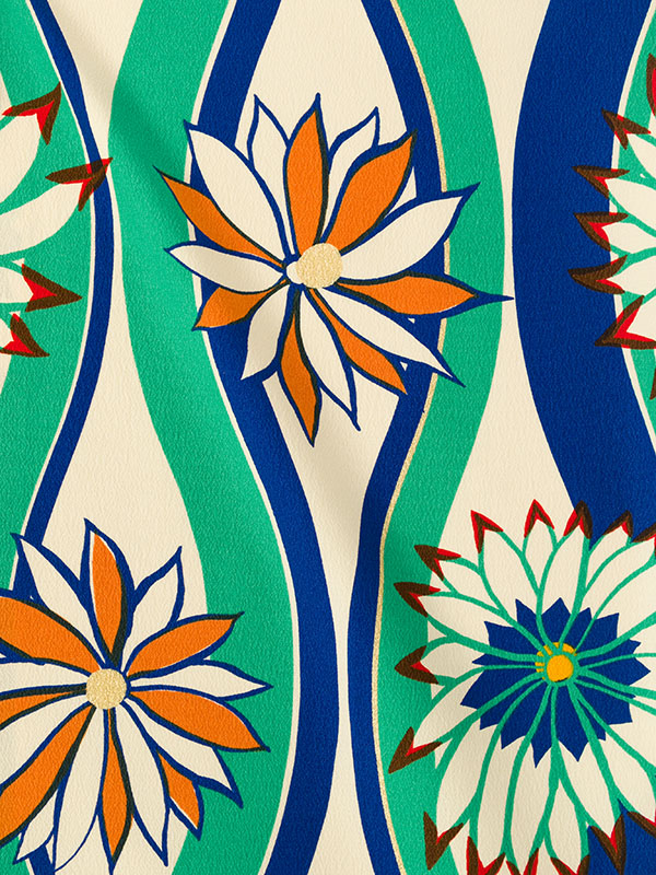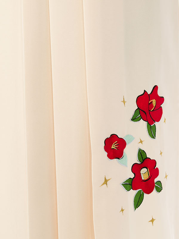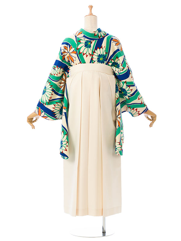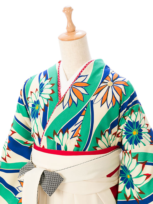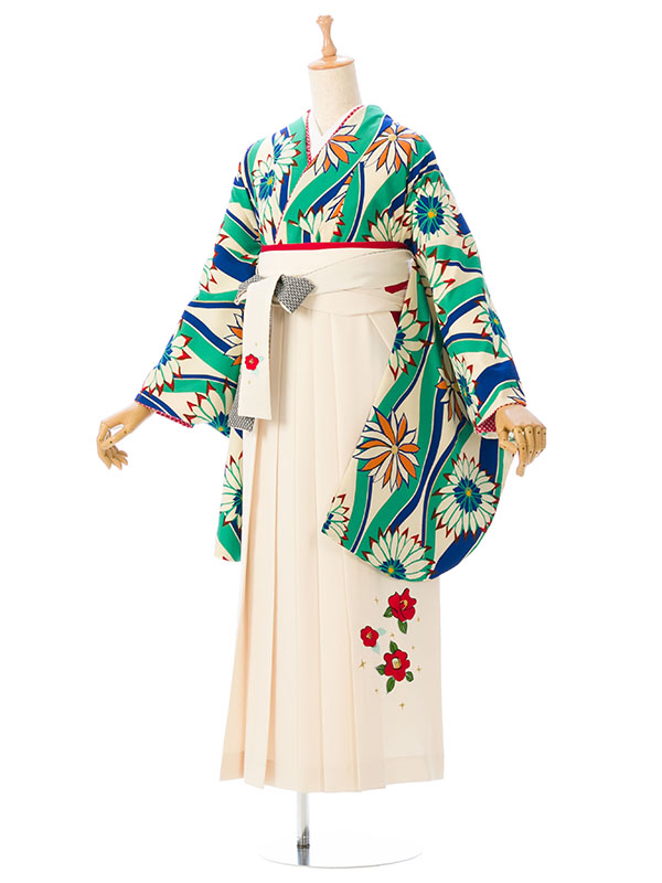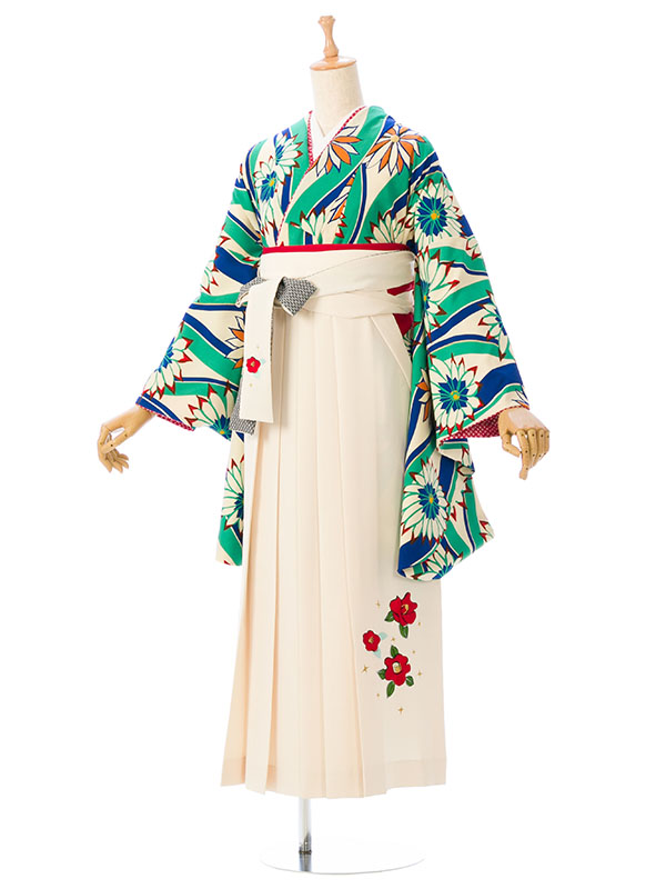 着物:【九重】ブランド 青地 よろけ菊 袴:クリーム 椿刺繍