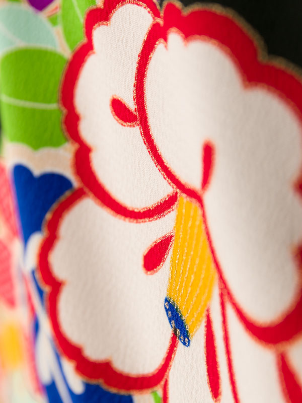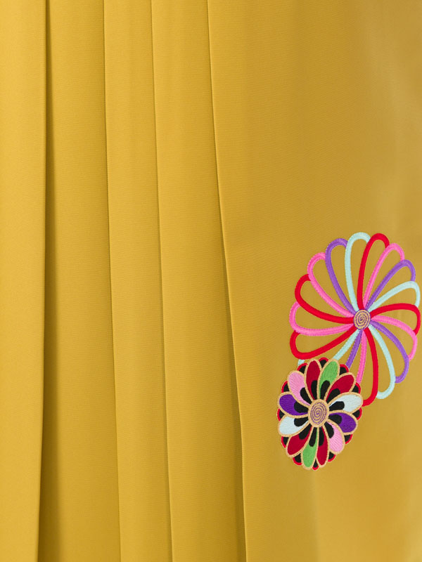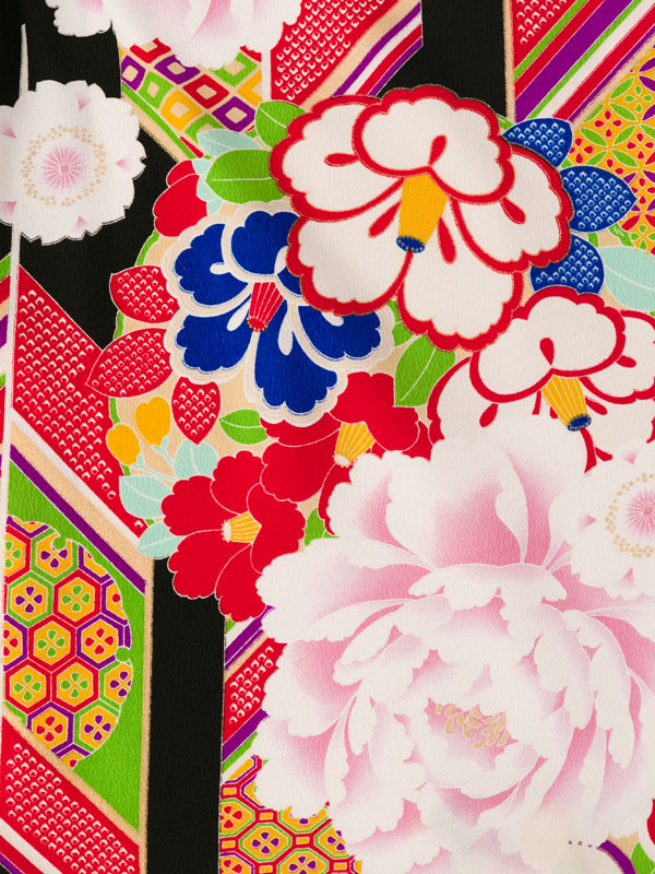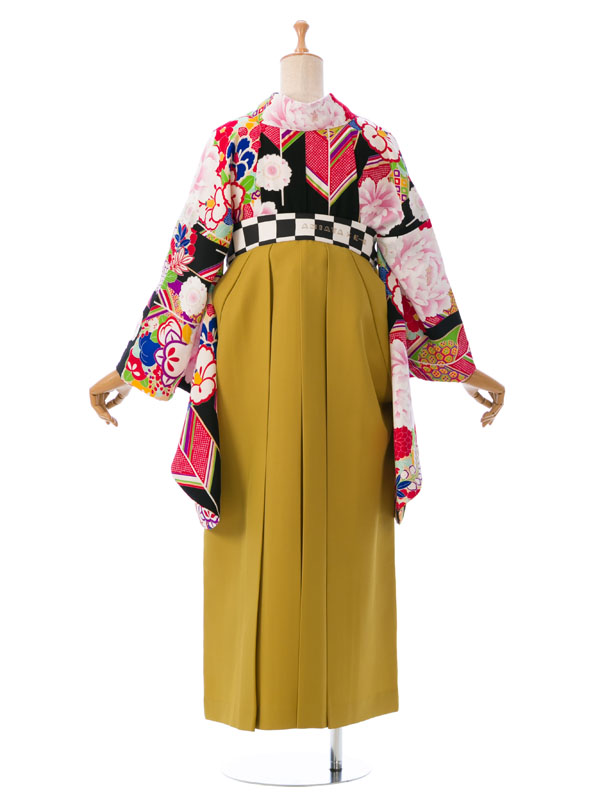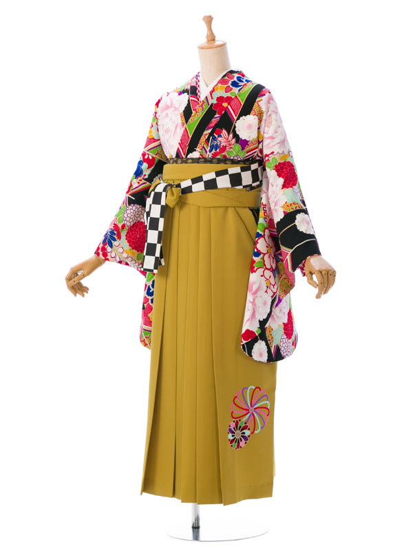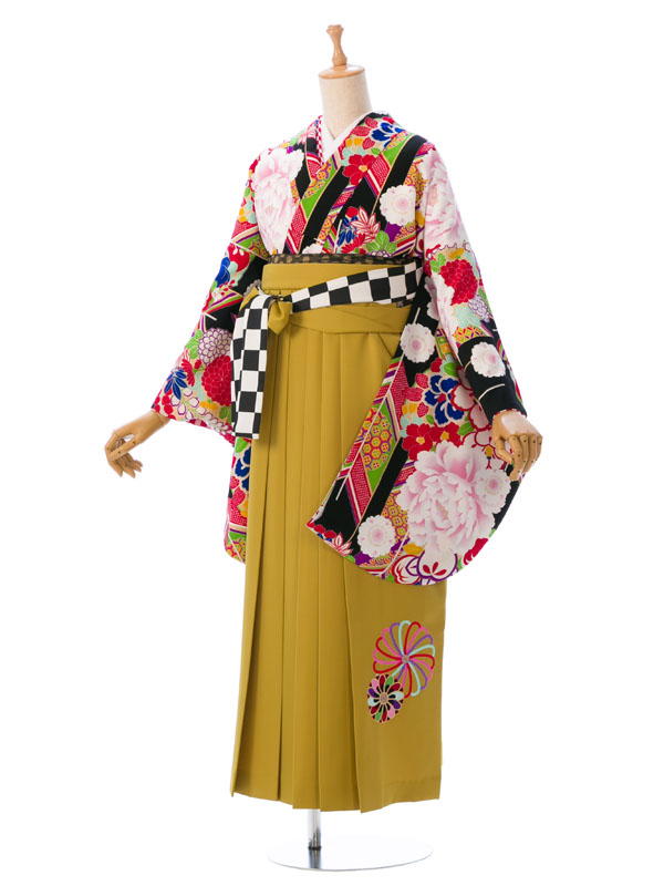 着物:黒地 矢羽根に牡丹 椿袴:からし地 市松 華紋 2.4