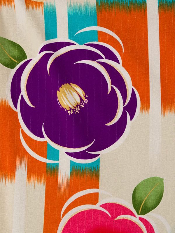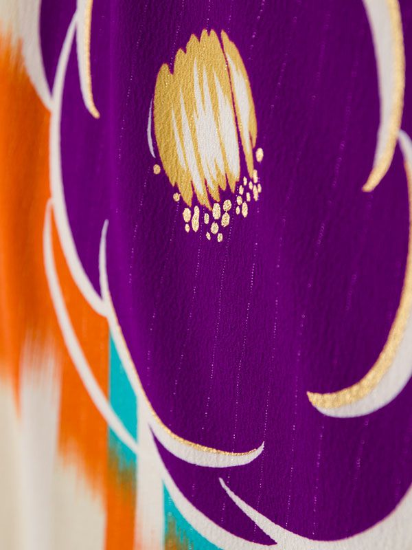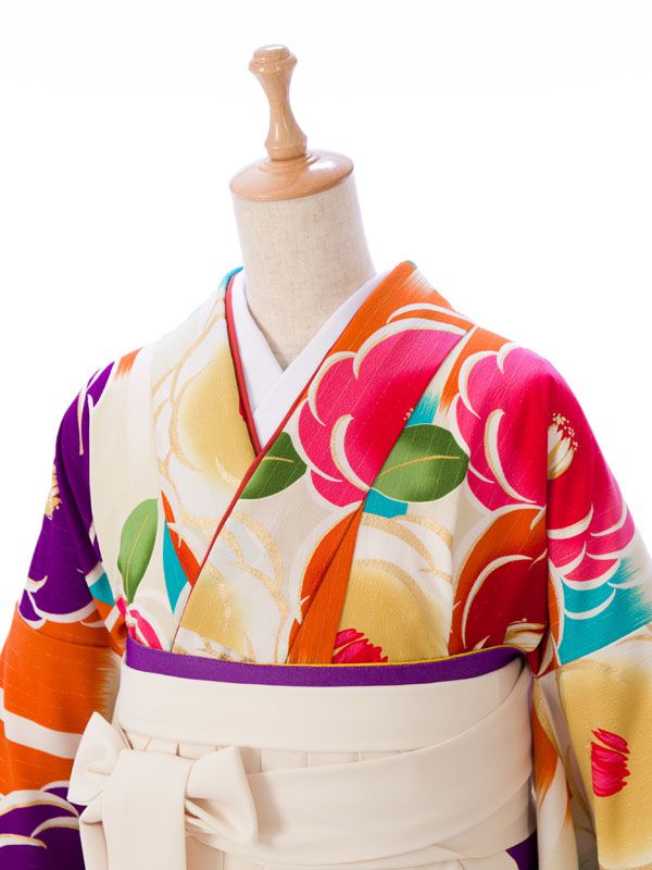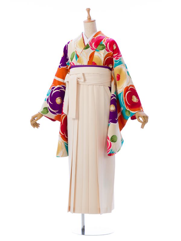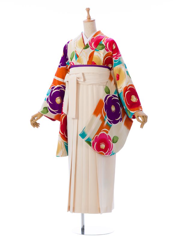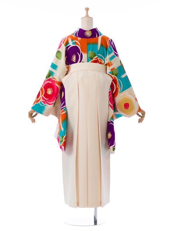 ■着物:クリーム×オレンジ 水色 MIX まあるい椿■袴:クリーム袴