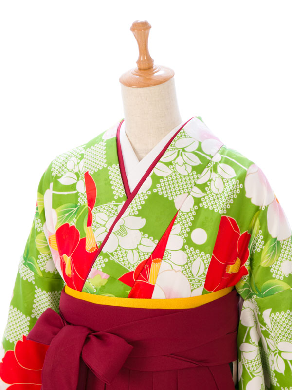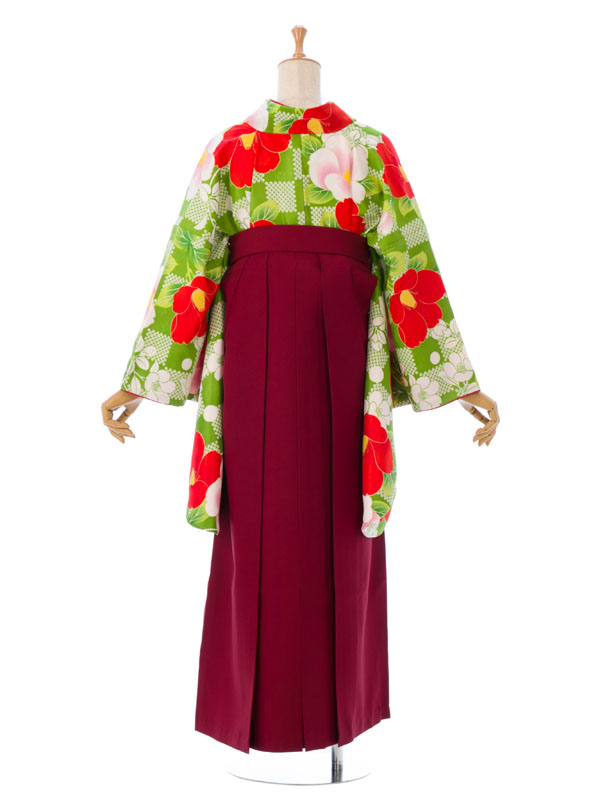 着物:黄緑×白 鹿の子市松に椿 袴:えんじ地 雪輪に梅刺繍