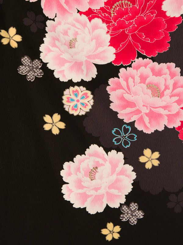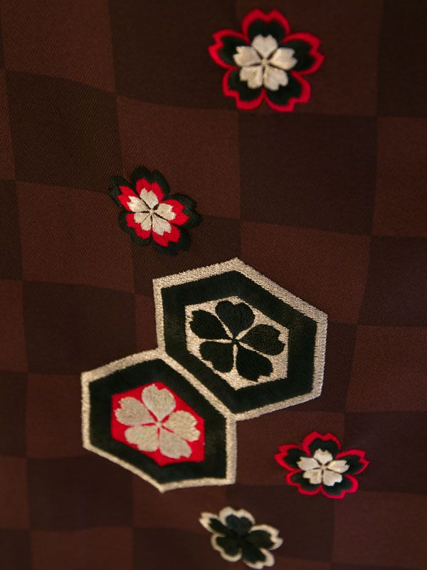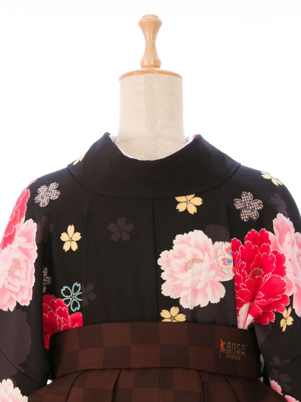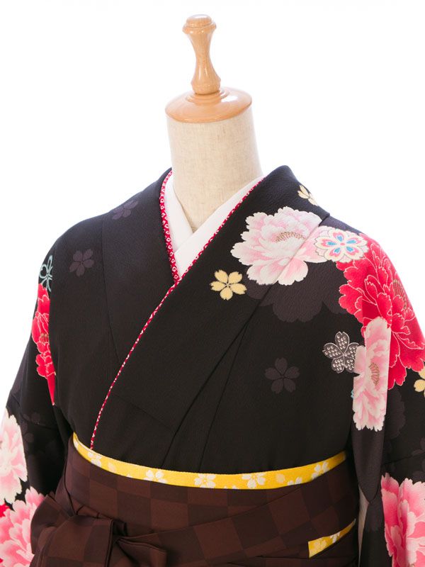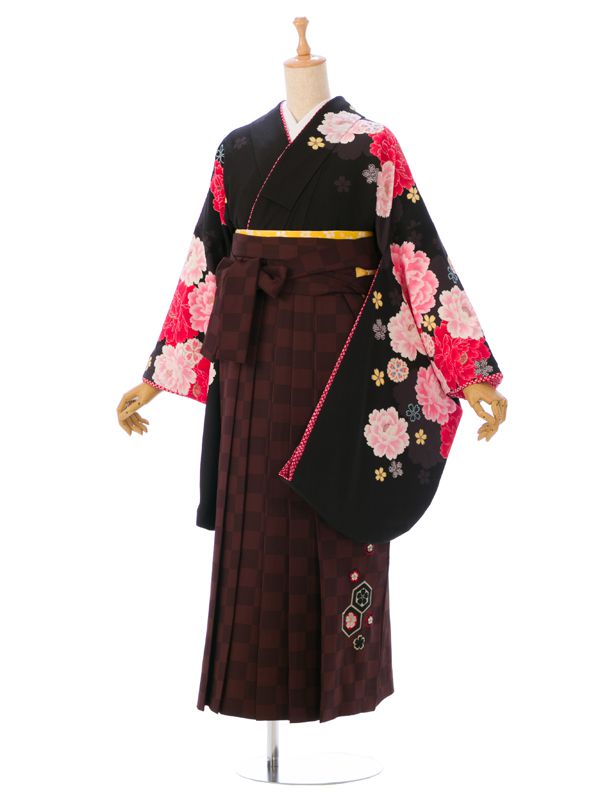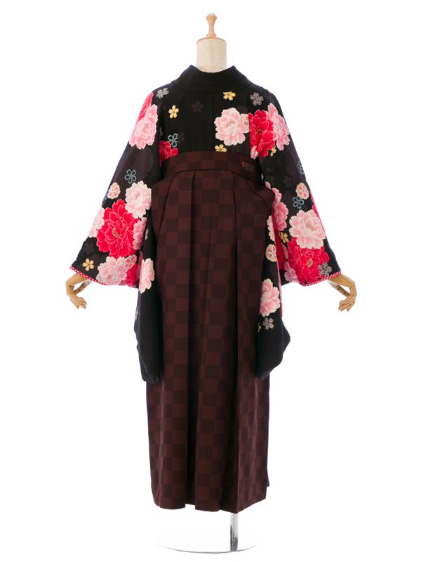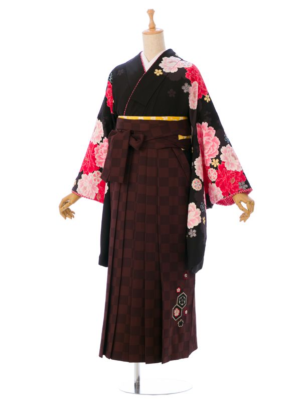 ■着物:黒地 紫ぼかし 薔薇 八重桜■袴:茶系