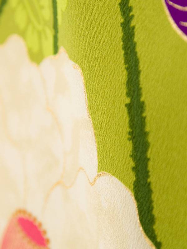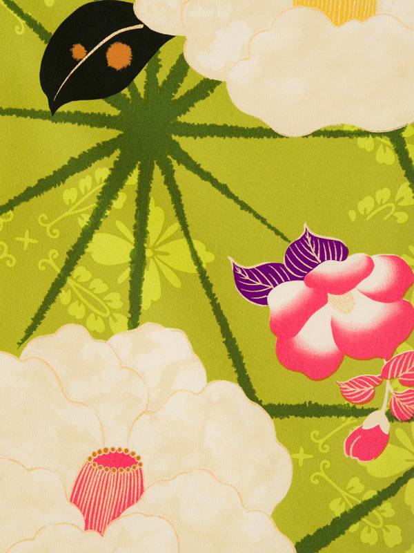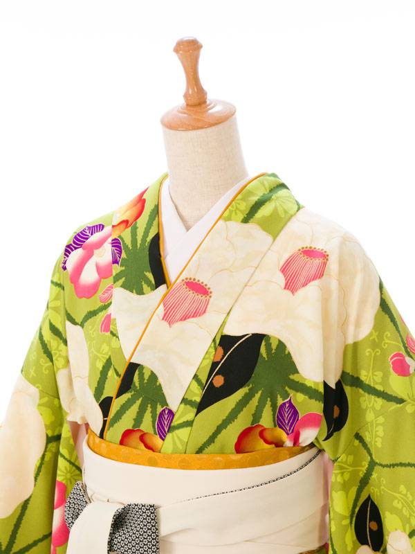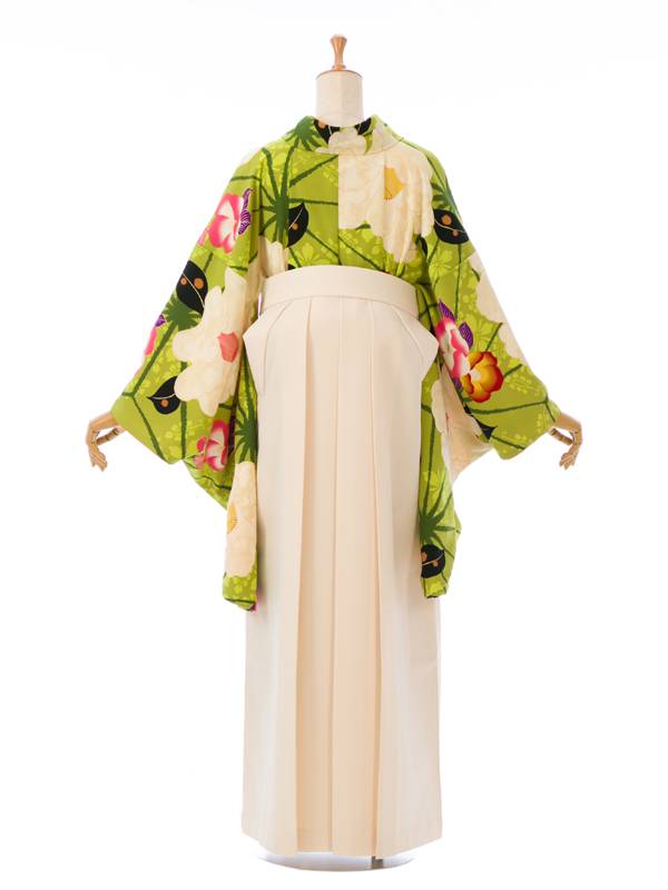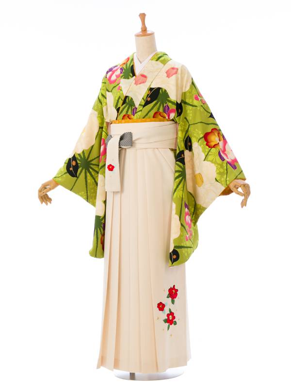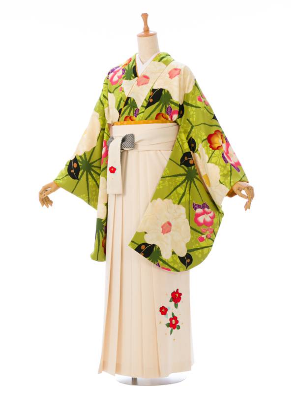 【着物色/柄】着物:抹茶 麻の葉に大椿 IN-5 袴:クリーム地