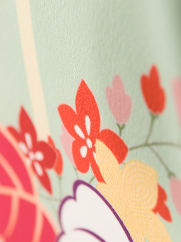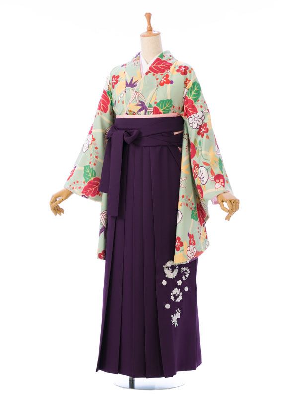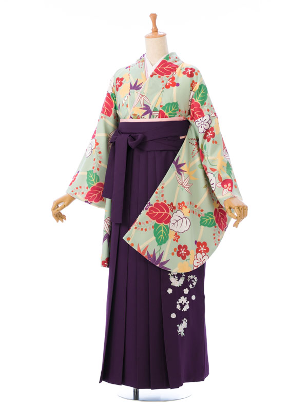■着物:グリーン地 立涌 橘 笹 葵 古典柄■袴:紫袴 花の丸刺繍 2.5