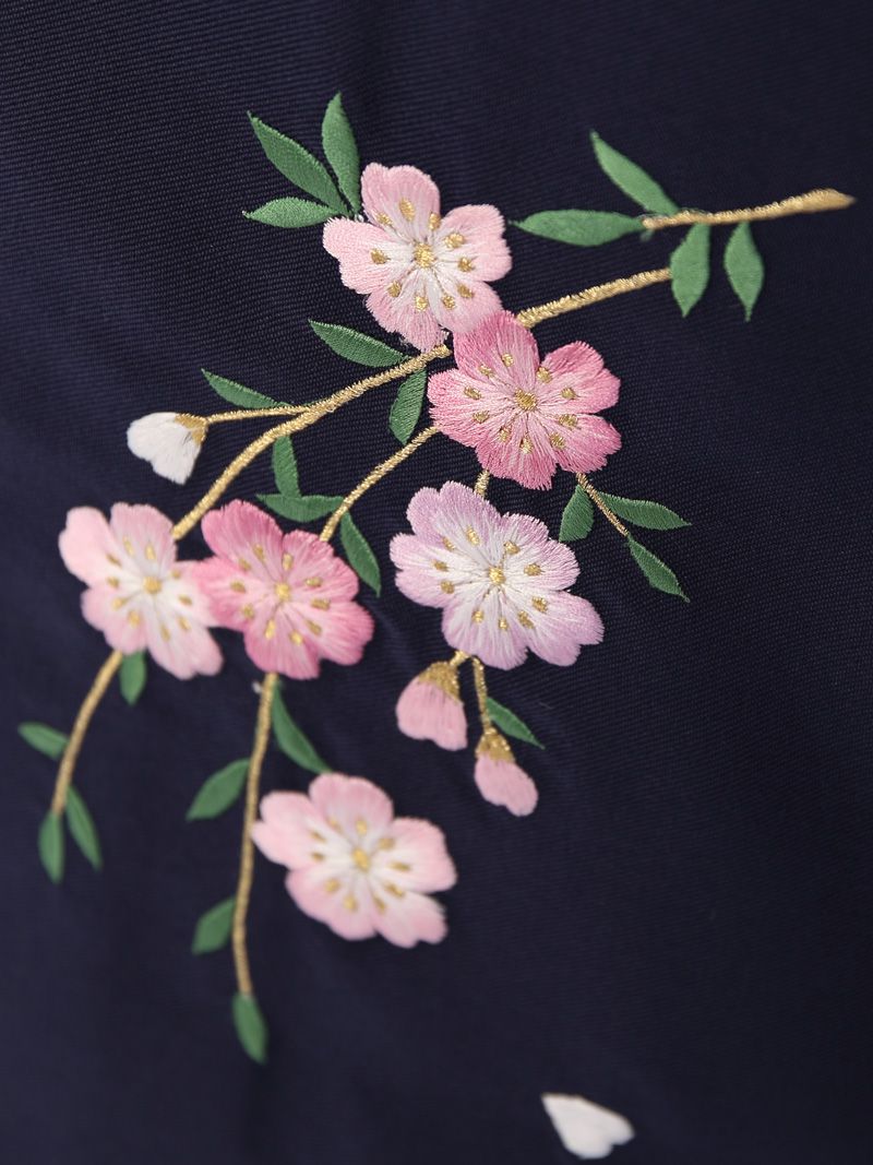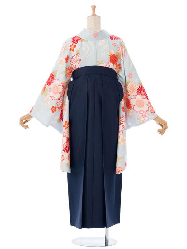 【着物色/柄】着物:水色地 桜 菊 流水 袴:紺袴 櫻刺繍
