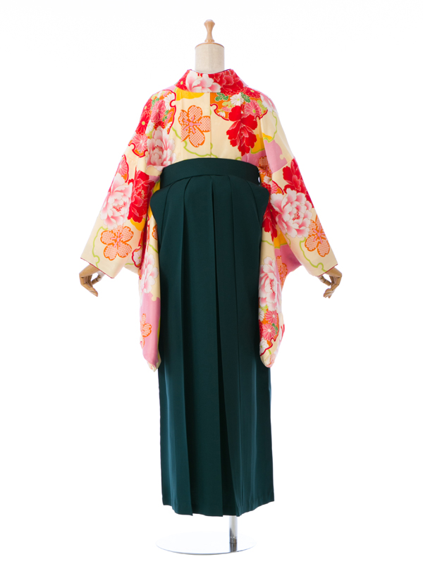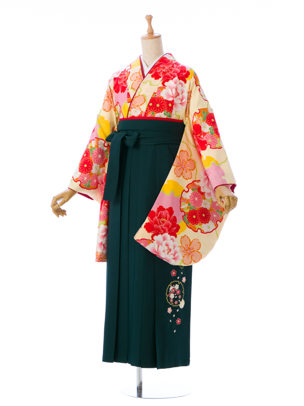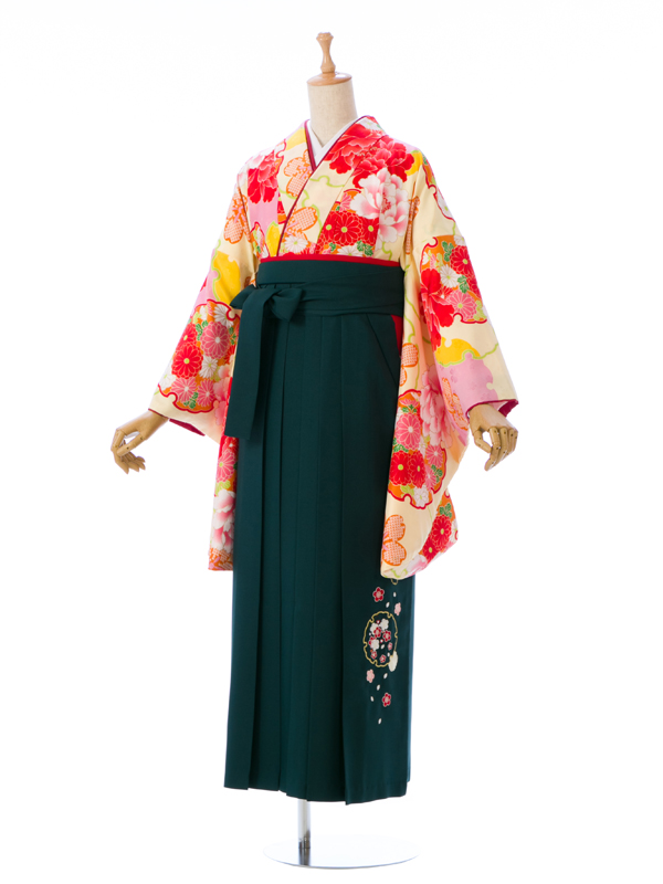 ■着物:クリームイエロー地 花雪輪■袴:グリーン袴 雪輪に梅刺繍