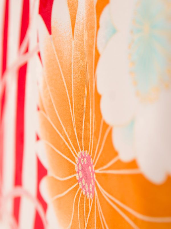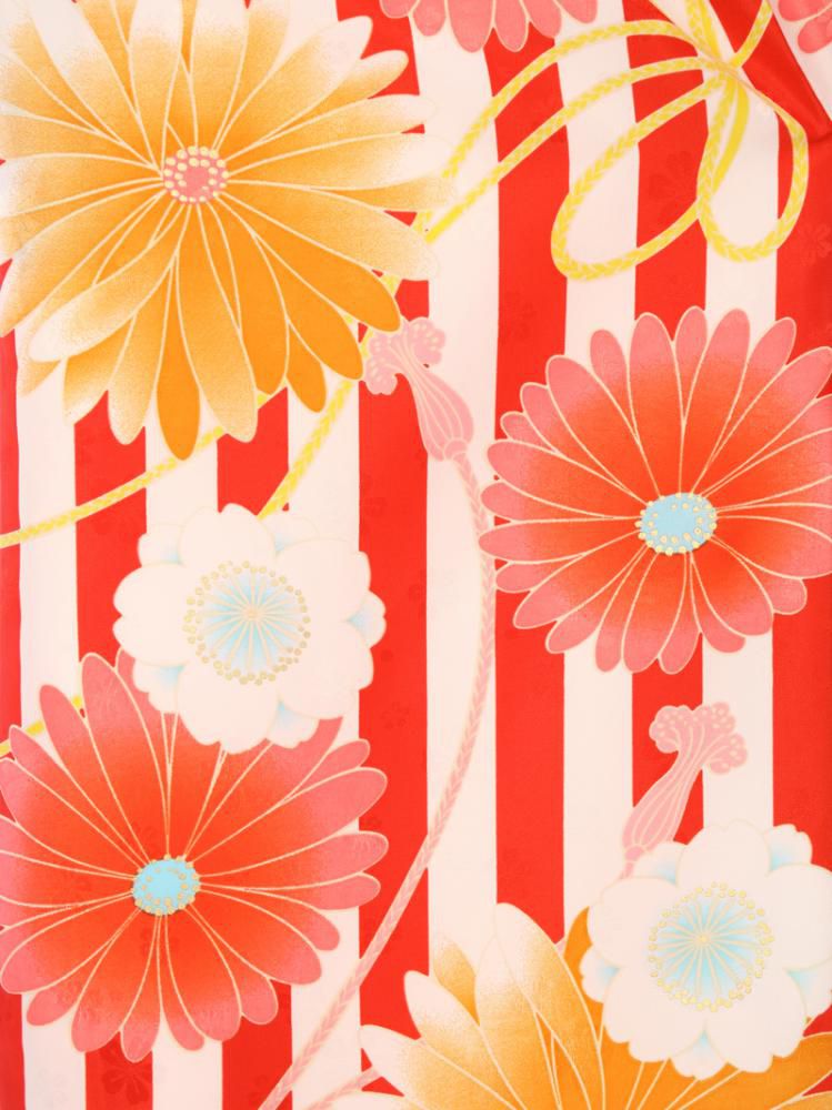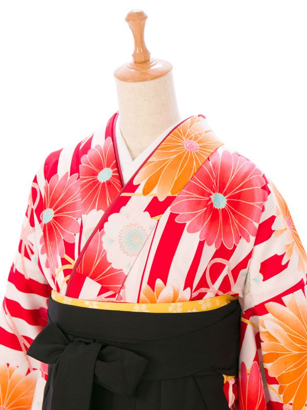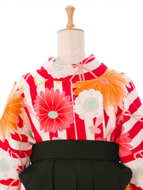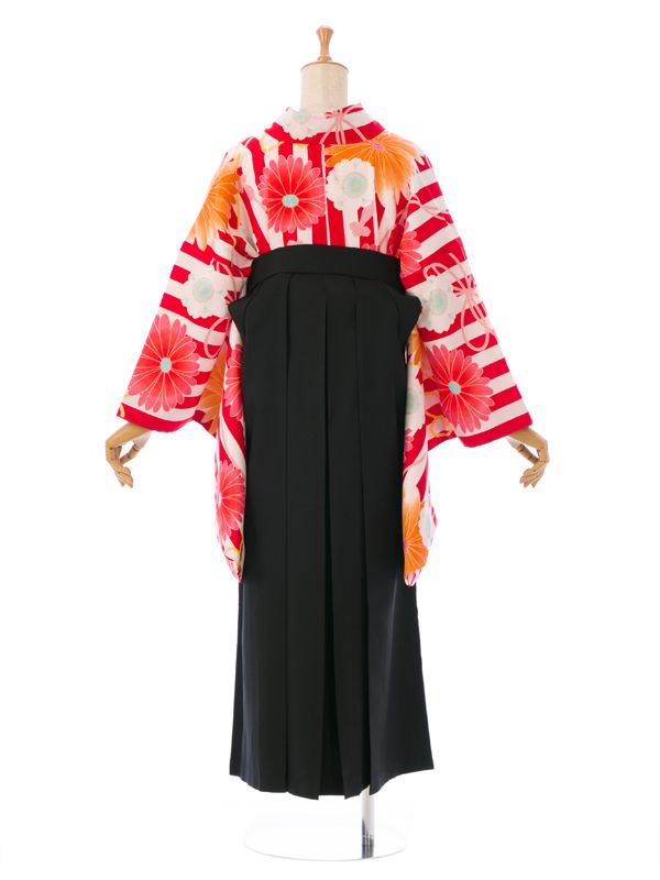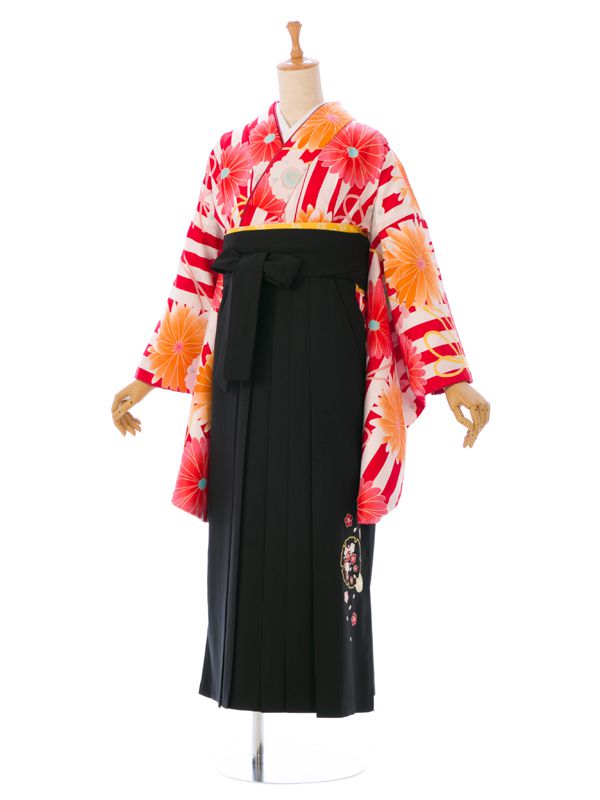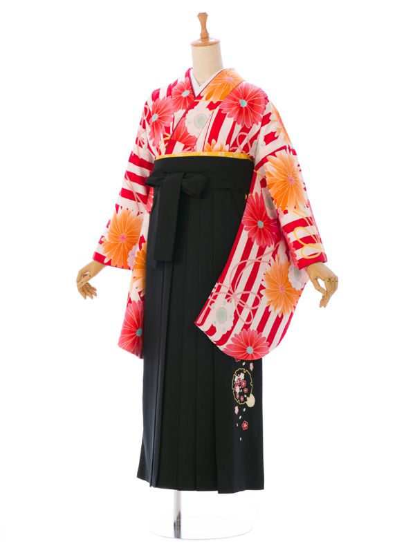 ■着物:赤白 縞に桜菊■袴:黒地 雪輪に梅刺繍