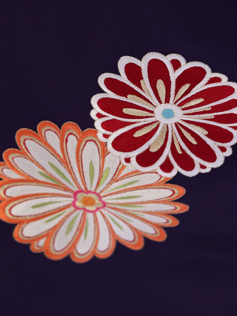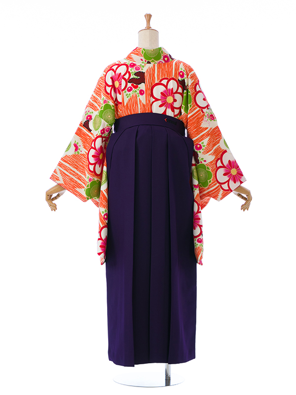 【着物色/柄】着物:クリーム地 オレンジ矢絣 梅桜 袴:紫袴 菊刺繍 ポリエステル