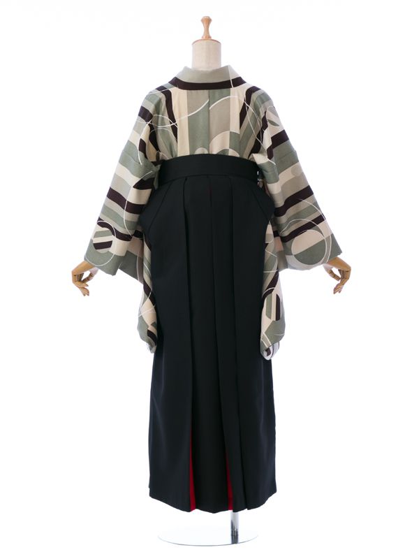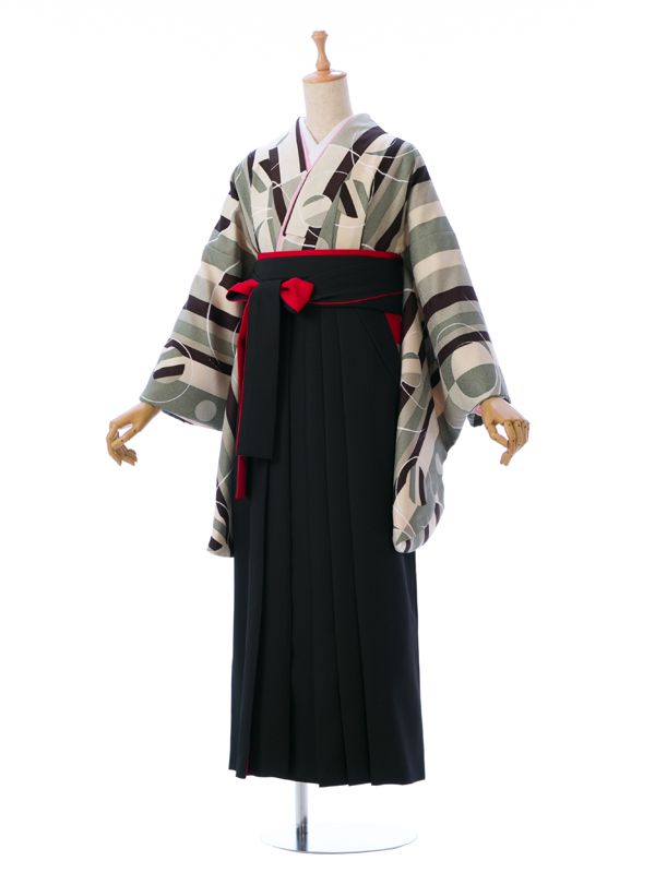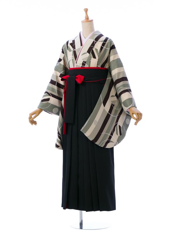 ■着物: モスグリーン 茶縞に丸■袴: 黒×赤袴 バイカラー 2.4