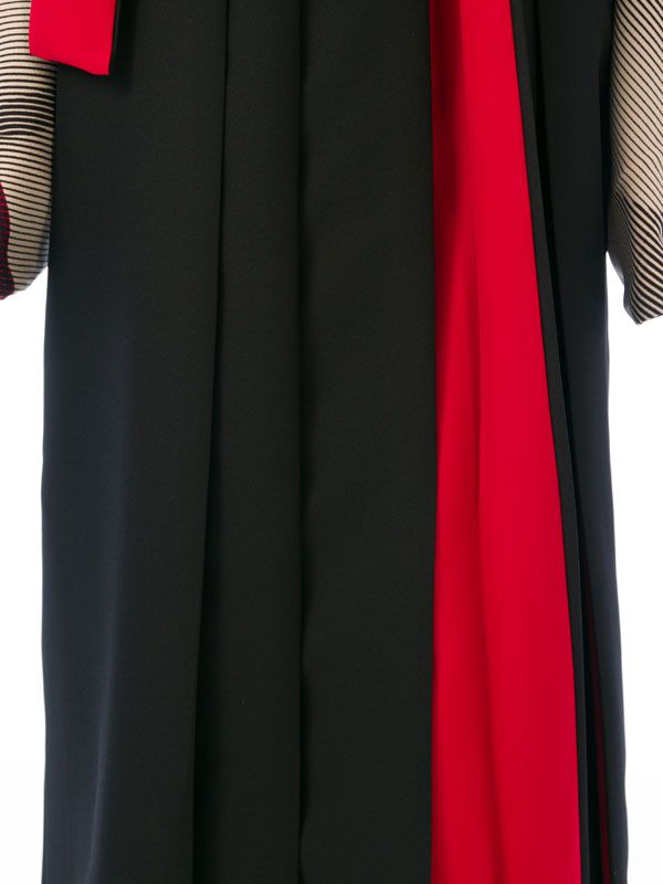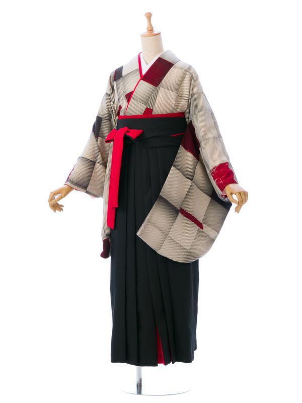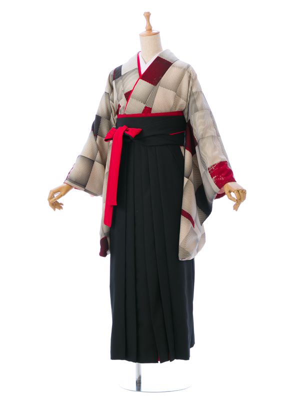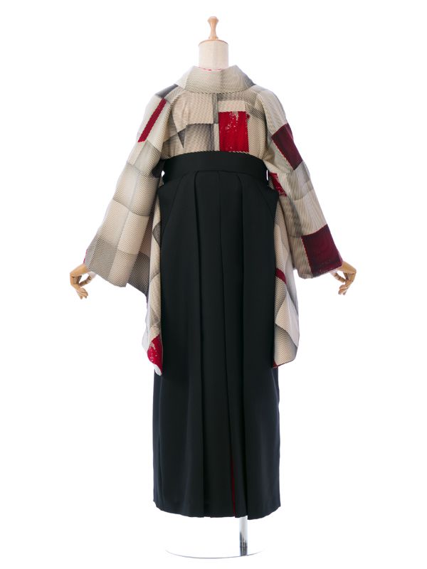 ■着物: クリーム 黒赤 格子■袴:黒×赤袴 バイカラー アコーディオンタイプ