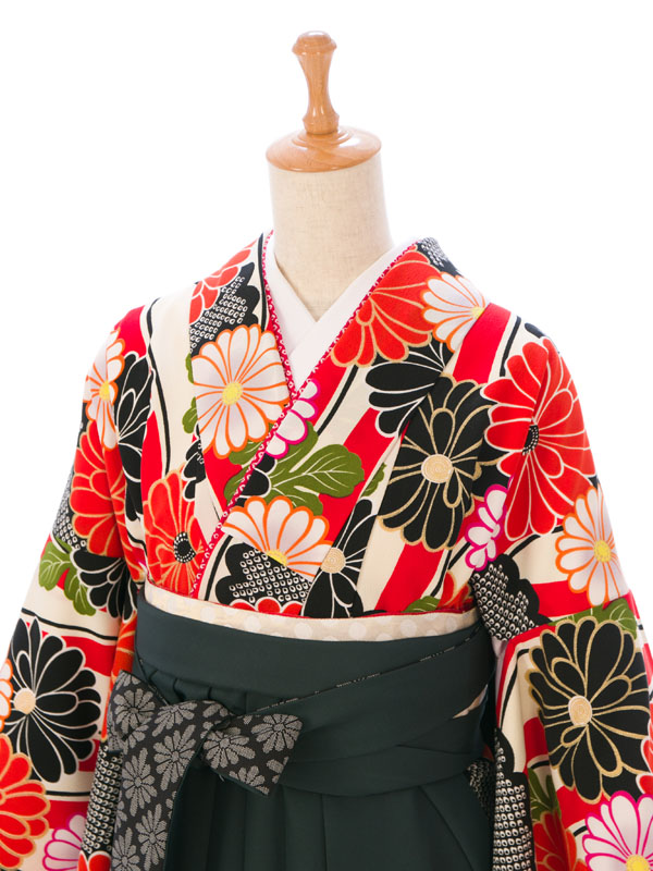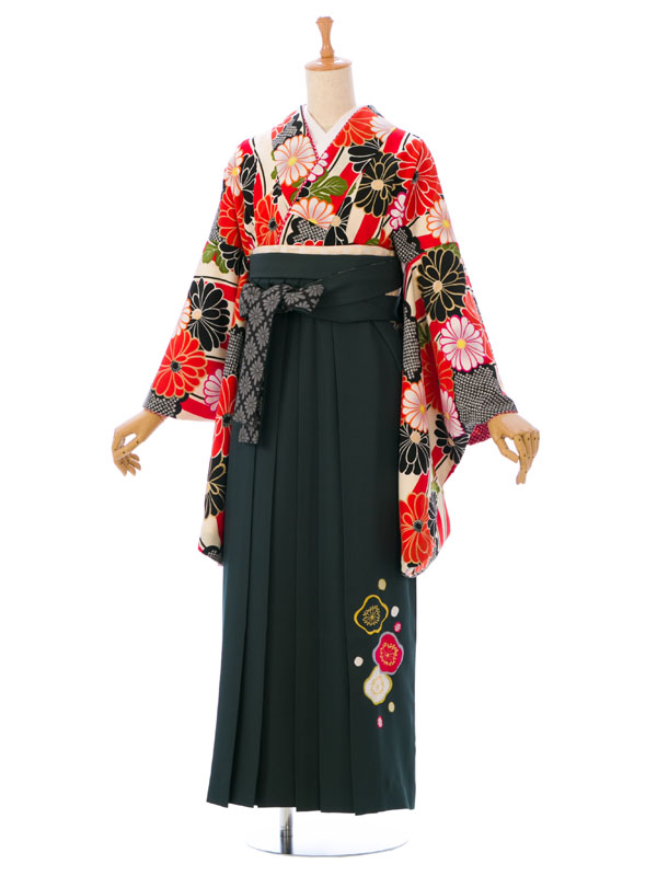 【色/柄】着物:クリーム 赤黒菊 袴:グリーン袴 梅刺繍