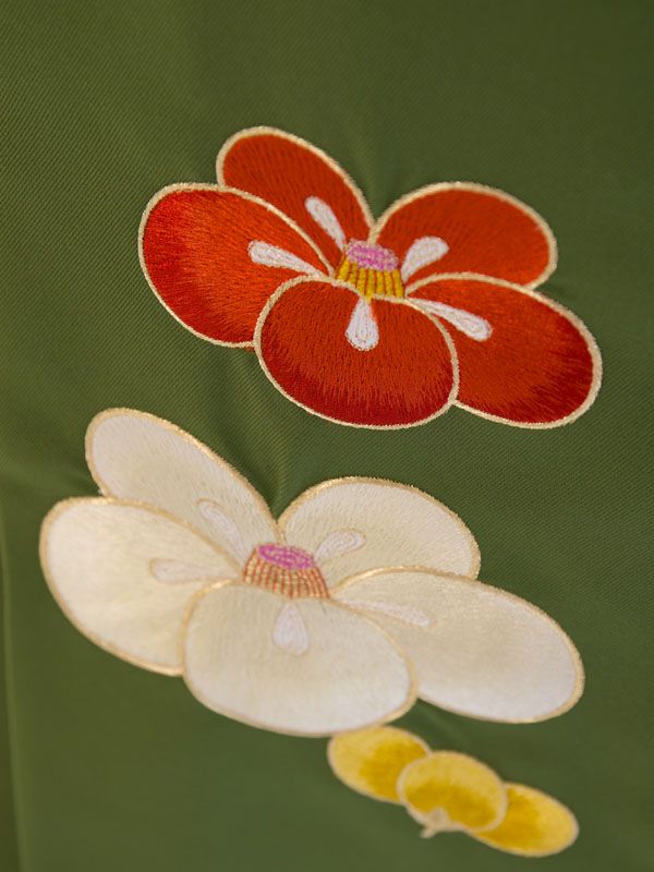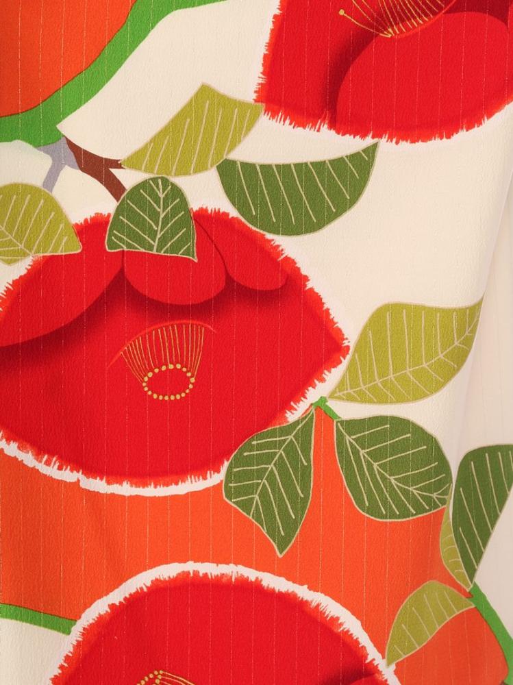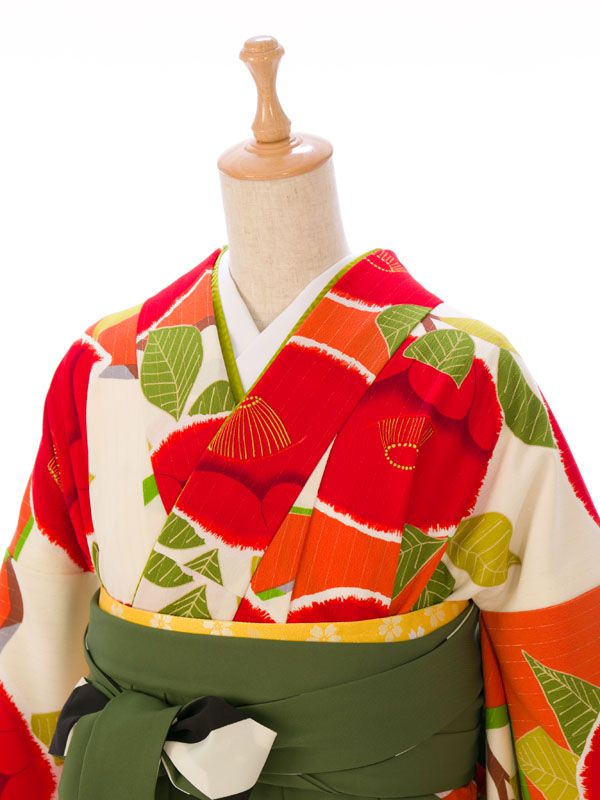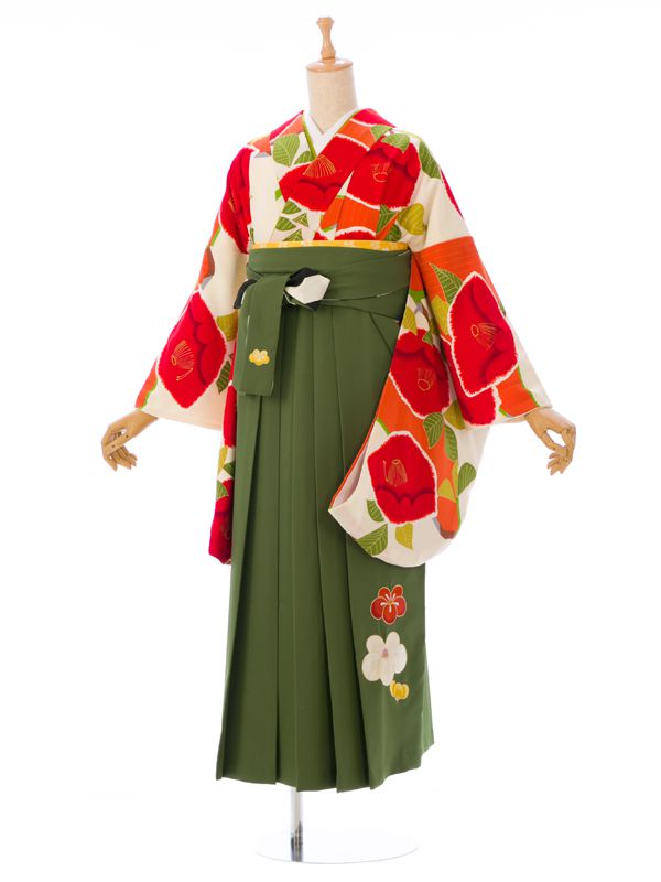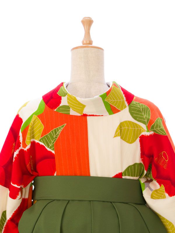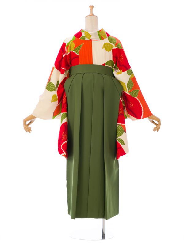 ■キモノ:オレンジ×クリーム 椿 紅一点■袴:抹茶 椿刺