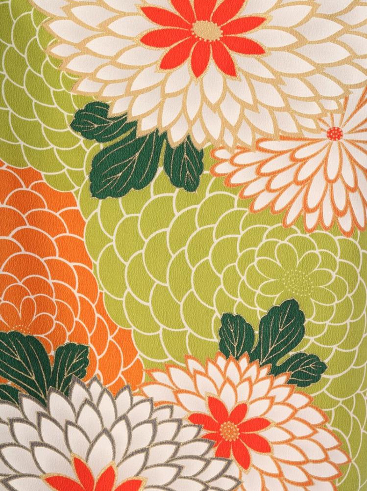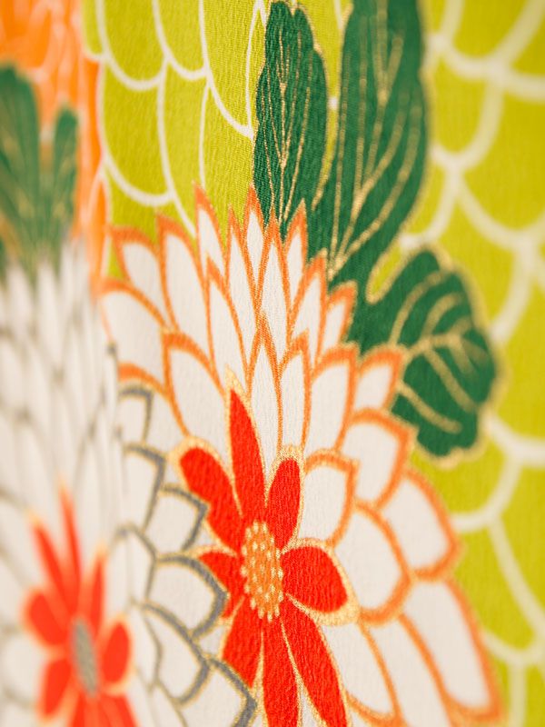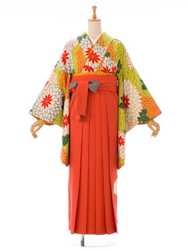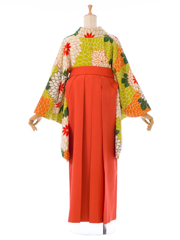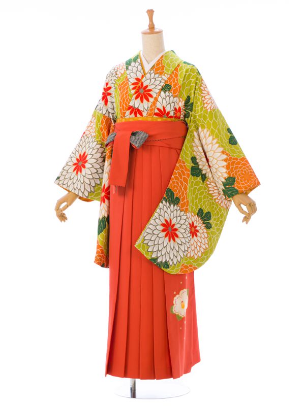 着物:九重 黄緑地(鶸色) 菊づくし袴:オレンジ地 椿刺繍