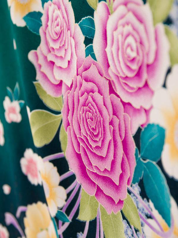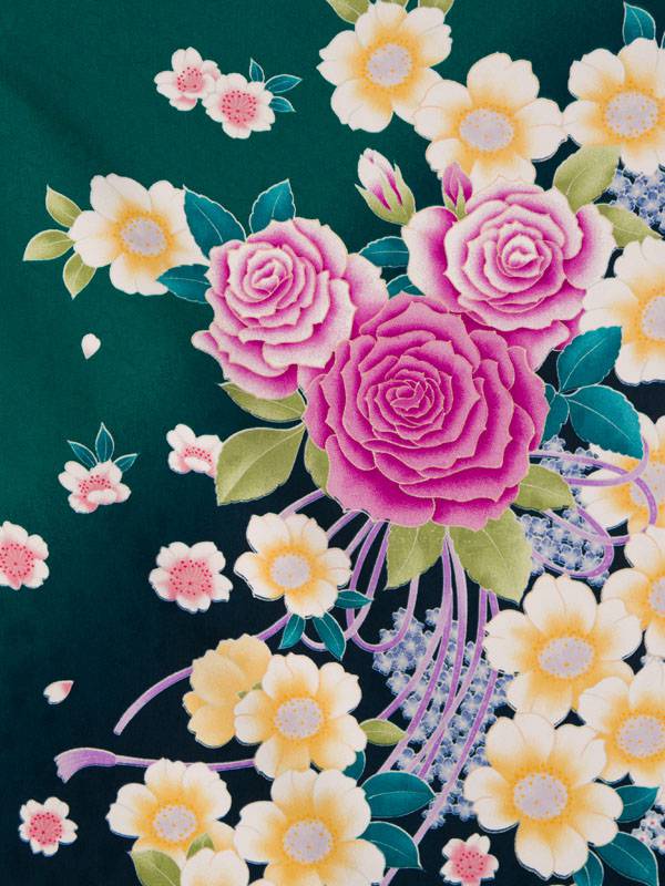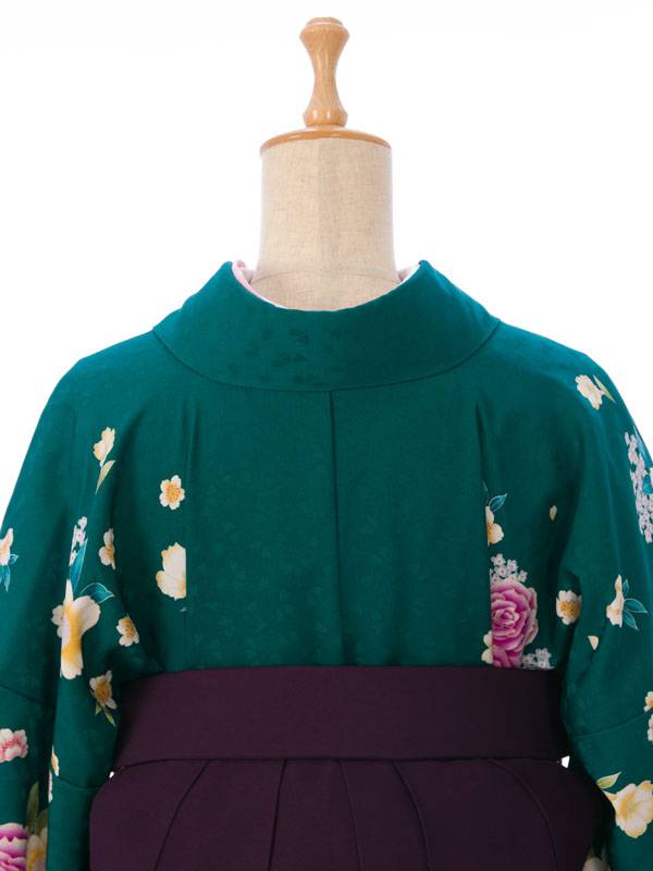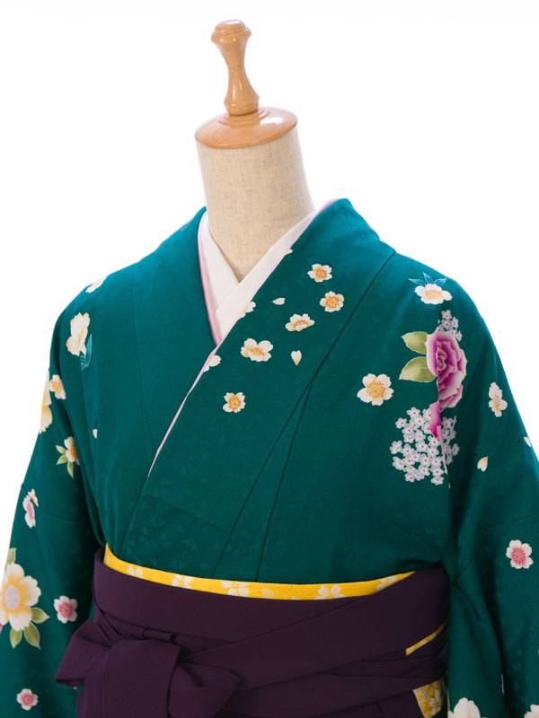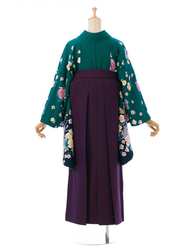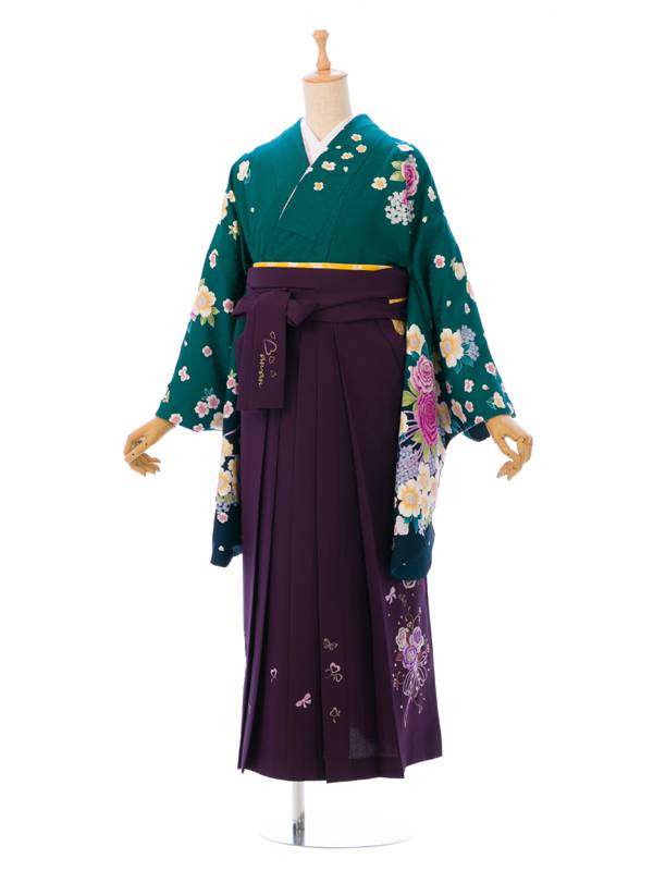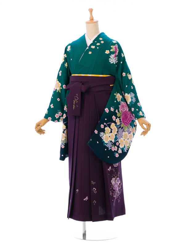 着物: グリーン地 薔薇と桜■袴: 紫地 薔薇 リボン