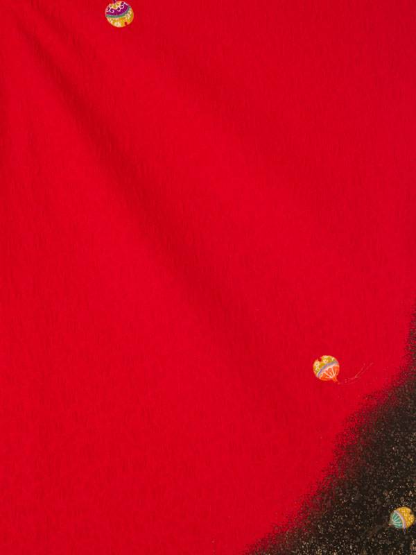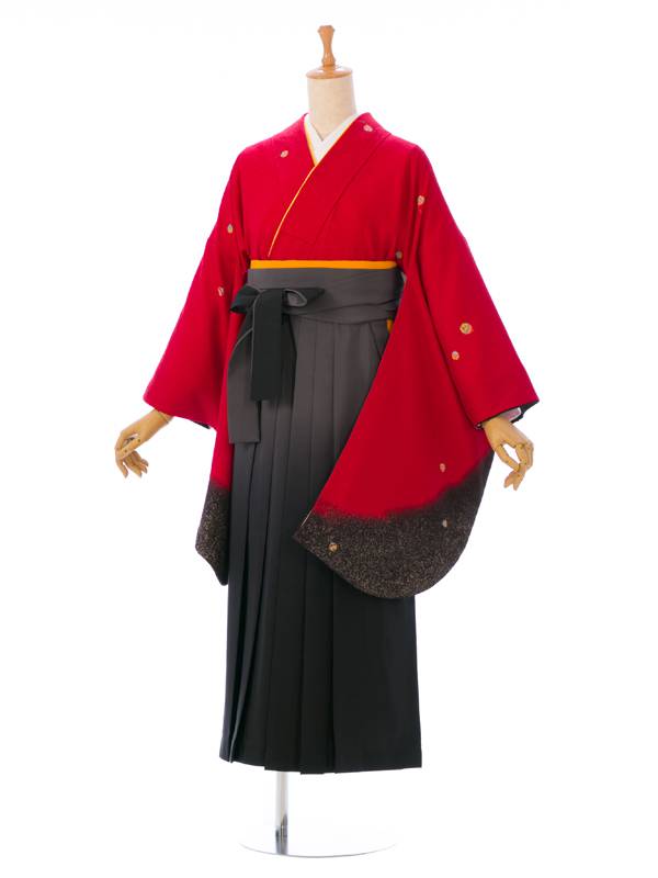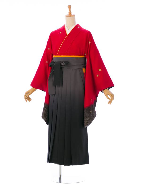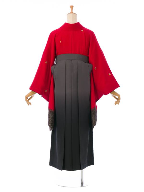 着物:赤地 袖黒ぼかし 鈴 袴:グレーぼかし