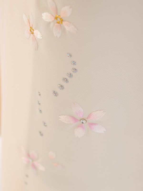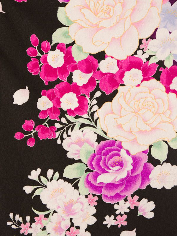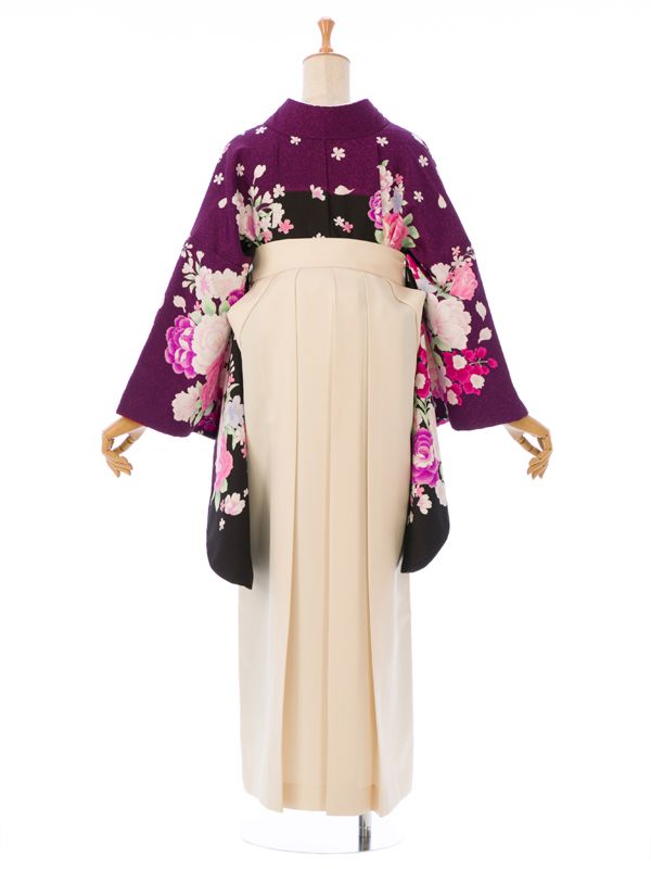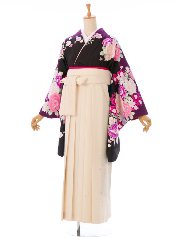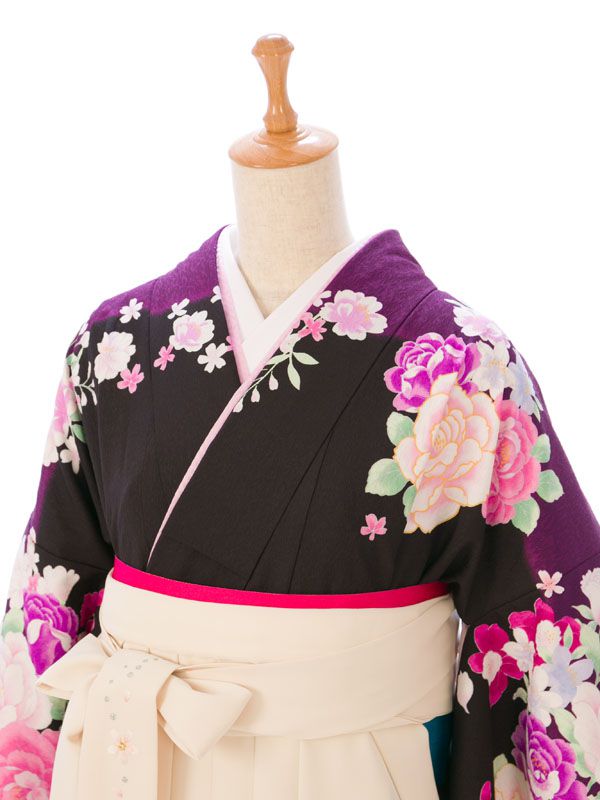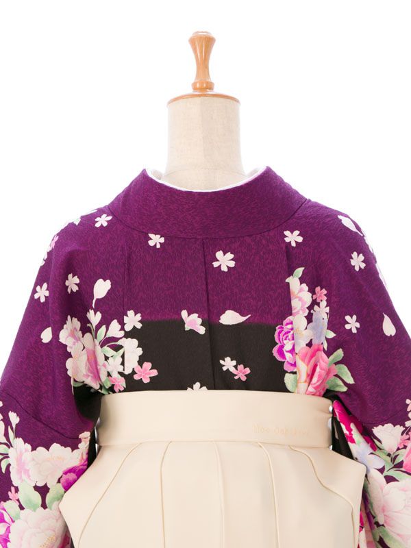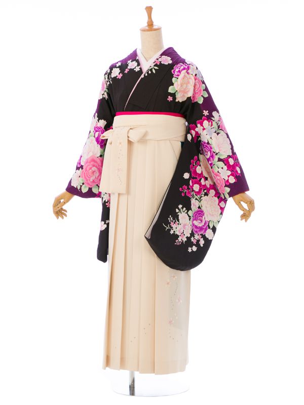 ■着物:黒地 紫ぼかし 薔薇 八重桜■袴:クリーム地 桜刺繍