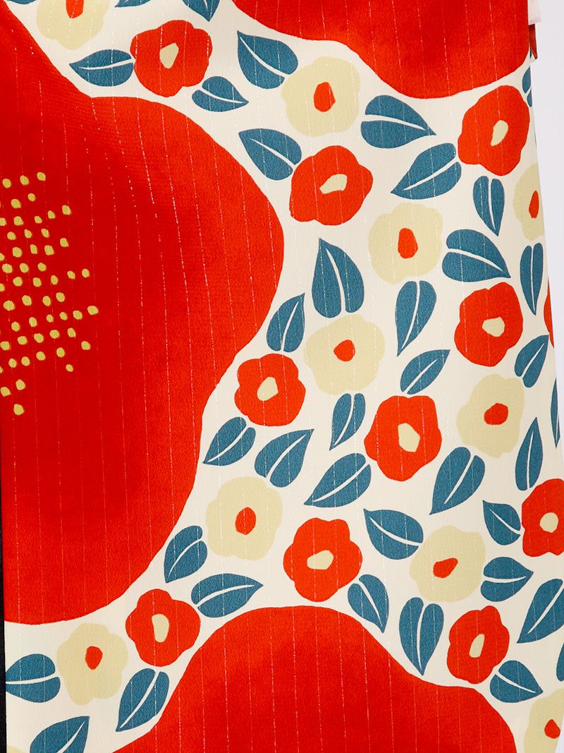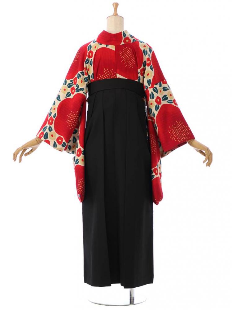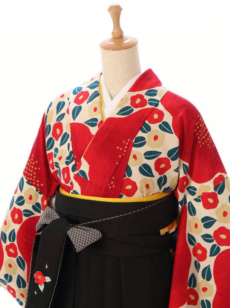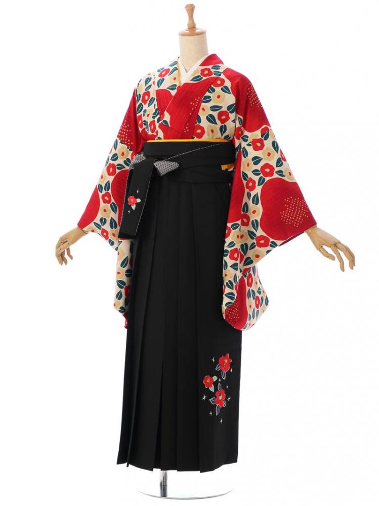 着物:白地 赤の大梅に椿 袴:黒地 椿刺繍