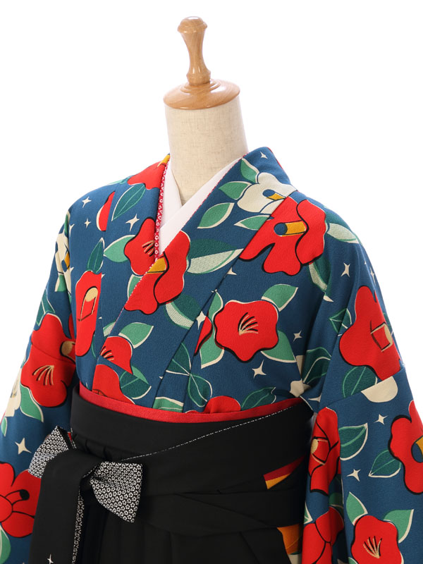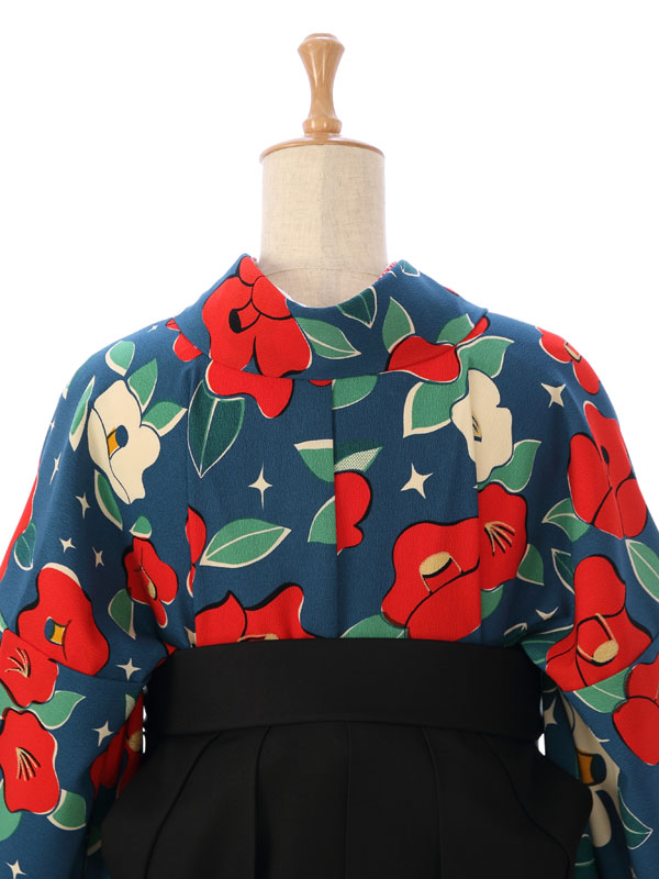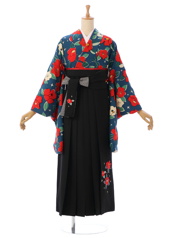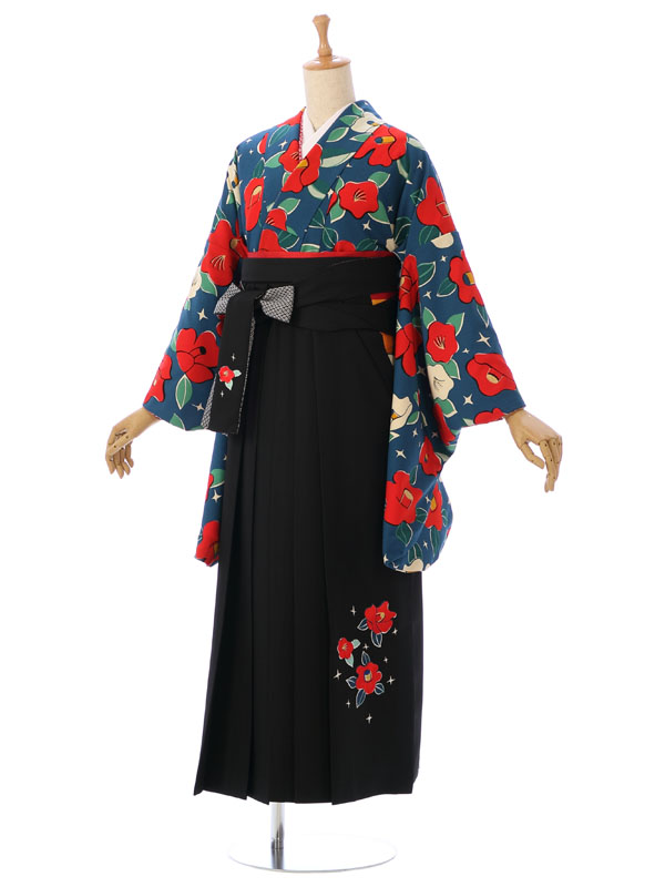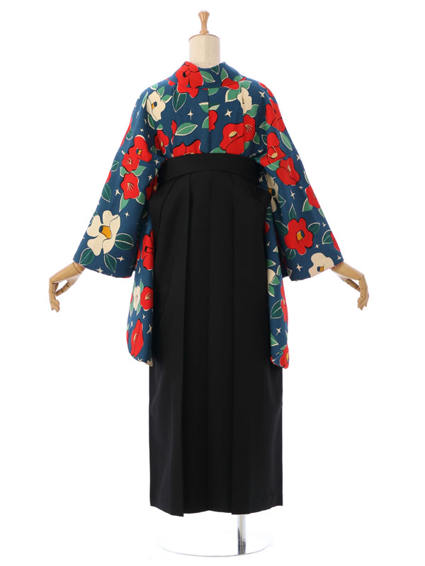 着物:【九重】ブランド 青地 椿 袴:黒 椿刺繍