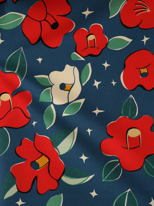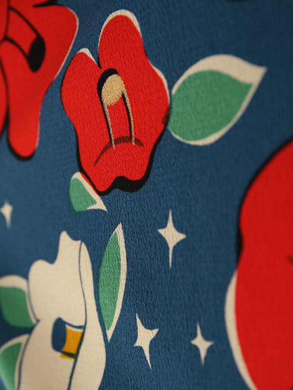 【九重】レトロモダンな椿文様を現代風にアレンジ♪ブルーの二尺袖はレア感ありです☆真っ赤な椿をユニークにアレンジしてアクセントに。レトロもモダンの雰囲気もたっぷりです♪R1360A_H128-26-3