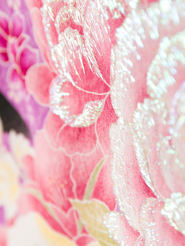 ■着物:黒地/ピンク 洋花■袴:紫袴 刺繍入り