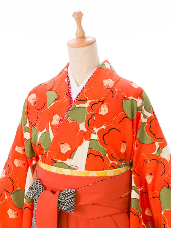 【着物色/柄】着物:クリーム オレンジ椿づくし KN-3 袴:オレンジ 椿刺繍 KH-2