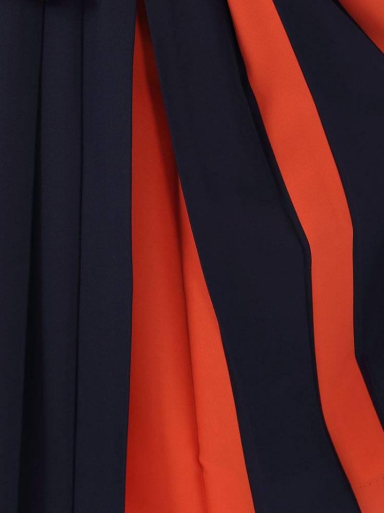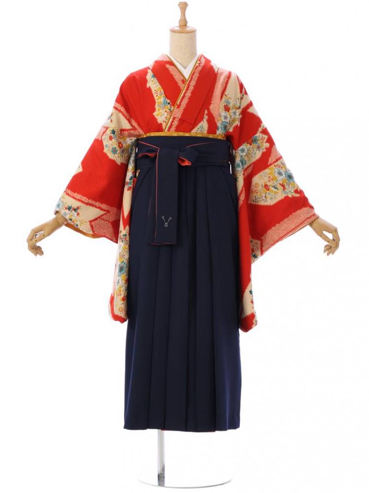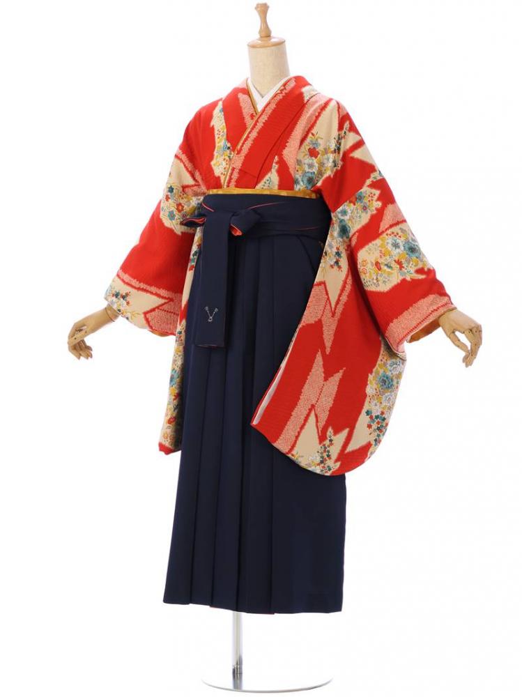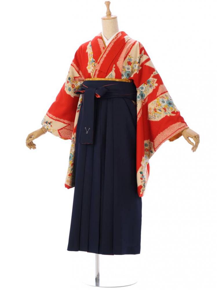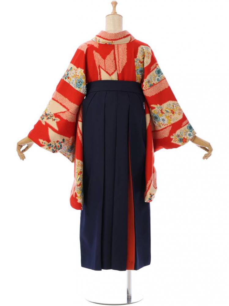 着物色/柄 :赤 アシュリ「矢羽」 MN-6 袴:紺×オレンジ バイカラー MH-1