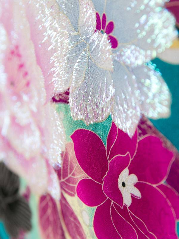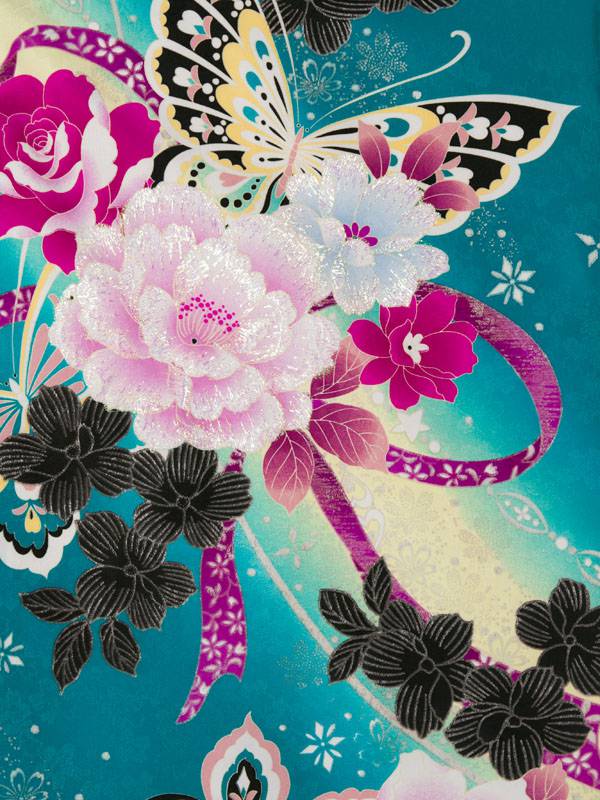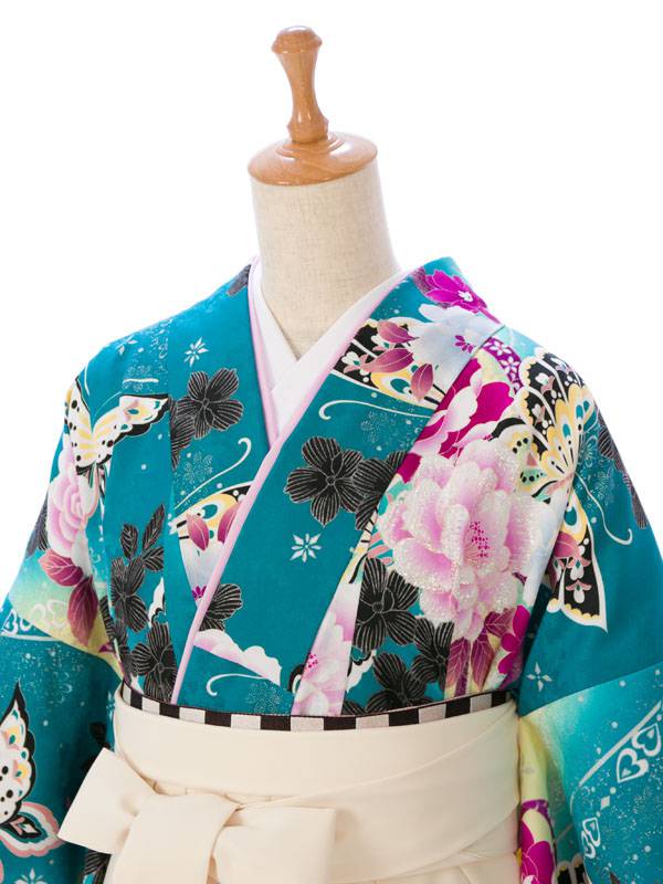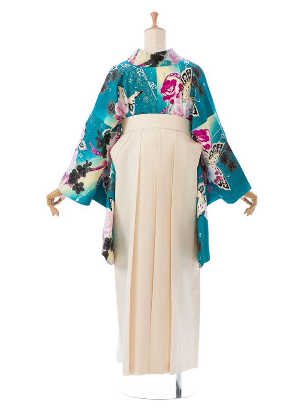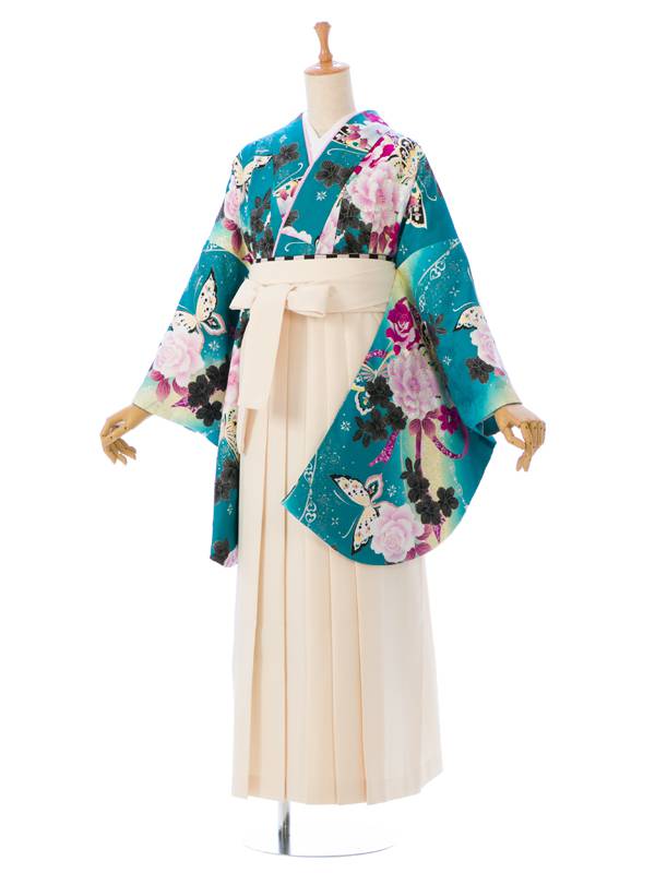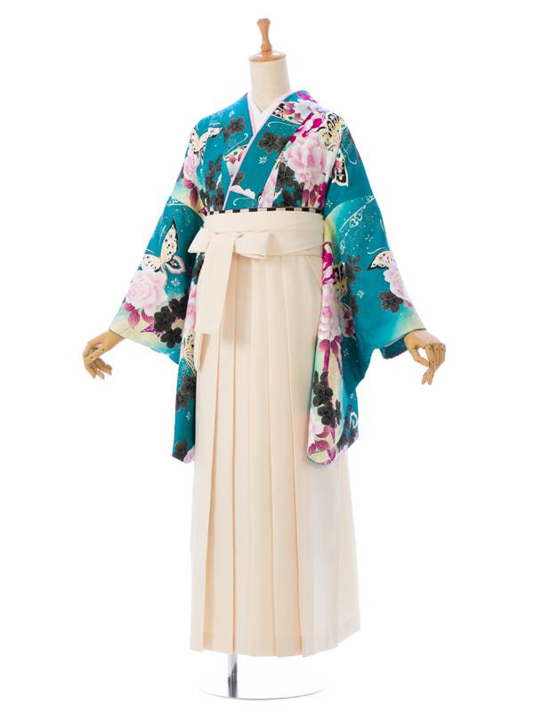 ■着物: グリーンぼかし 薔薇 蝶 リボン 銀彩■袴: クリーム袴 2.5