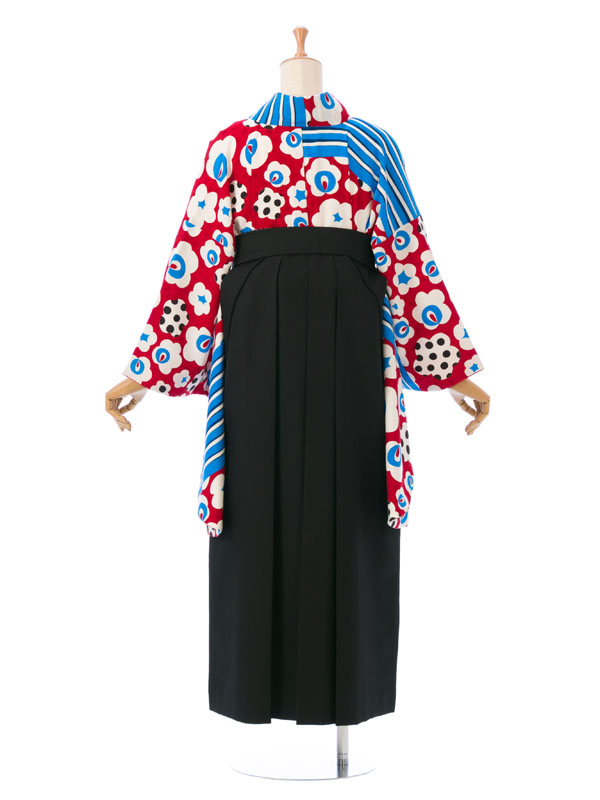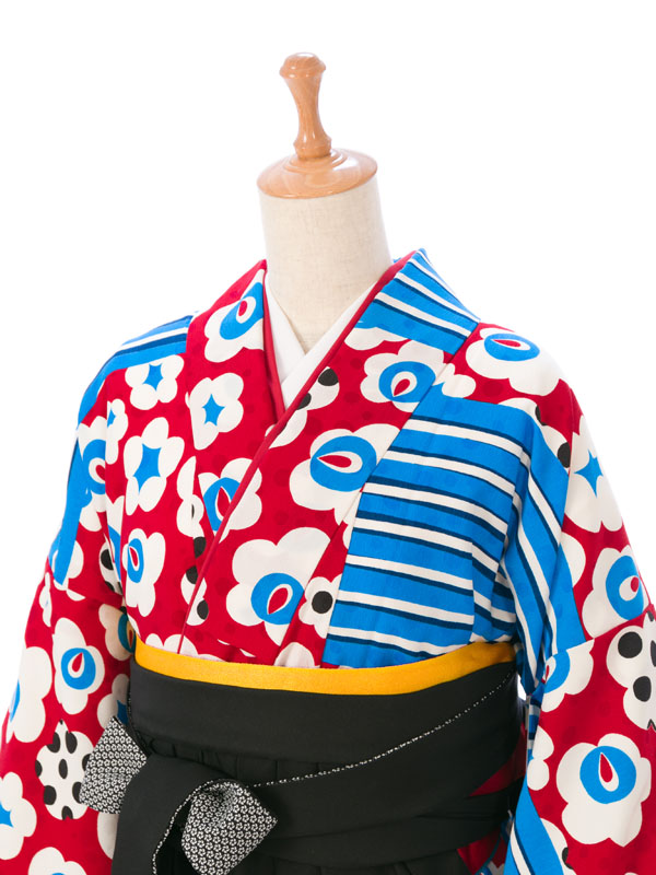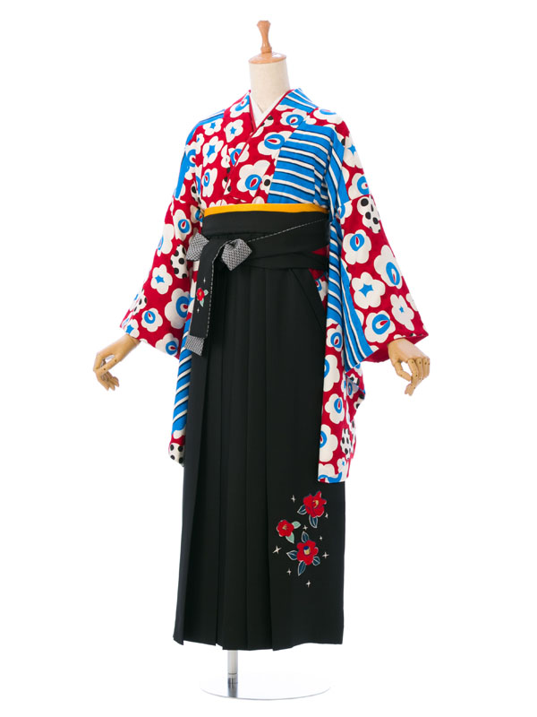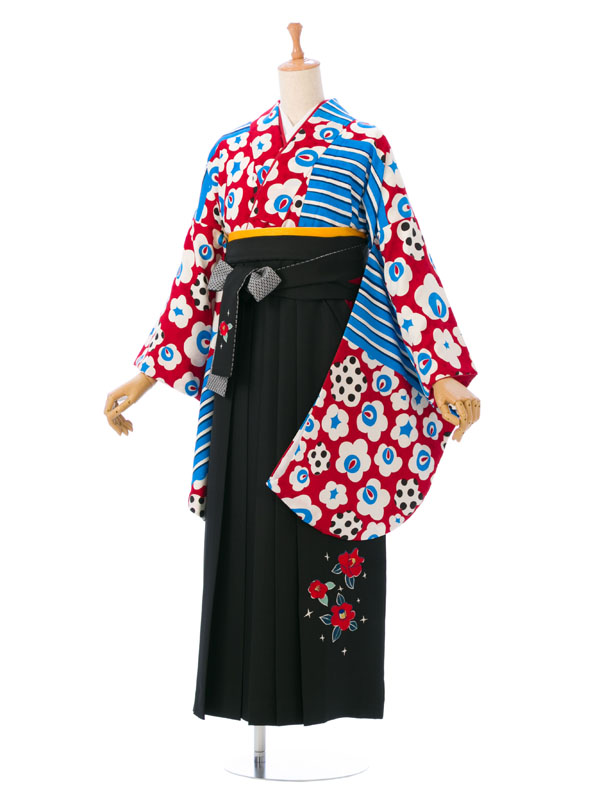 ■着物:モダンアンテナ 赤×ブルー地 コンセプトフラワー■袴:黒地 椿刺繍 2.4