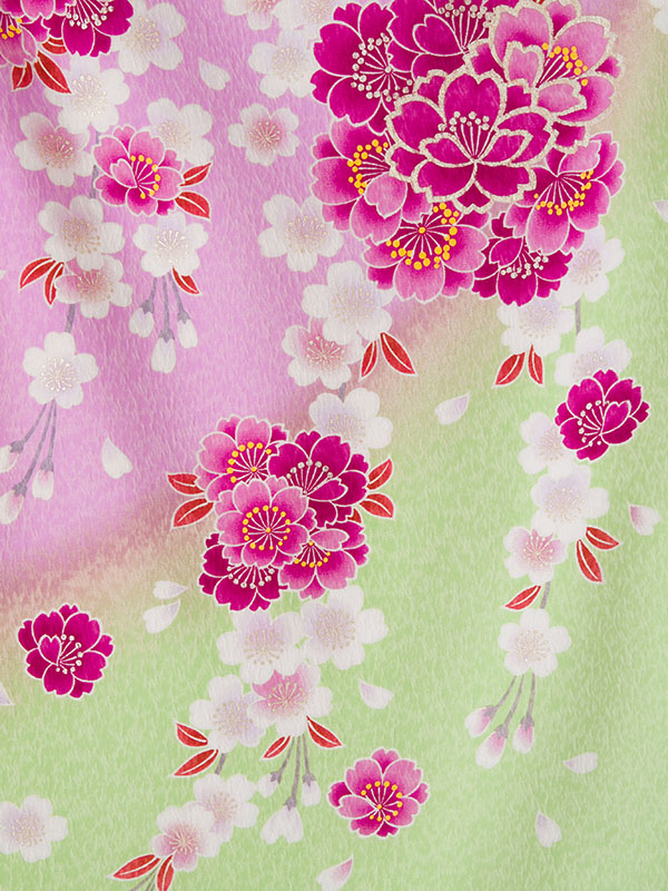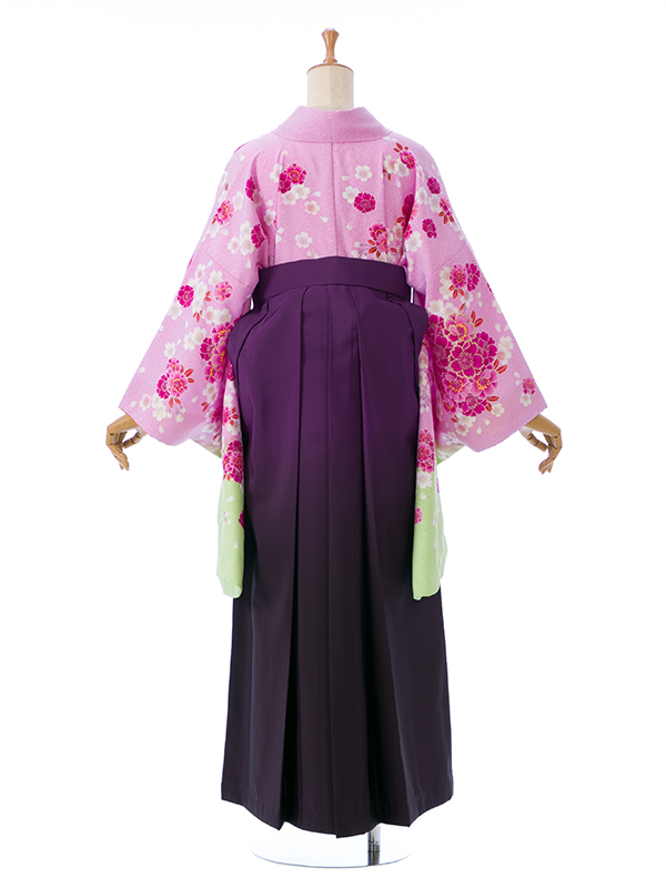 ■着物:ピンク地 パステルグリーンぼかし 桜尽くし■袴:紫ぼかし袴 桜刺繍