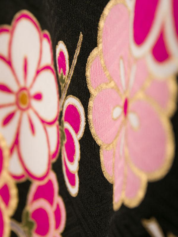 色/柄 着物:【京都 九重】 黒 紗綾形地紋 椿に松竹梅 袴:赤 梅刺繍